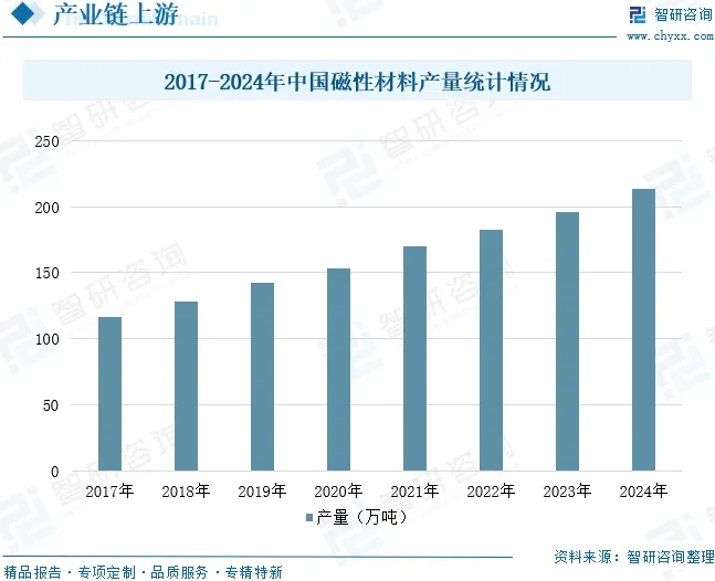 磁性材料作为开关电源中不可或缺的核心组件,承担着多重关键功能:它不仅是构成变压器和电感器磁芯的基础材料,实现着能量的高效存储与稳定转换;还通过其特有的磁饱和特性为电路提供可靠的过流保护机制;同时,高频铁氧体材料的应用显著降低了磁芯在工作过程中的能量损耗;此外,磁性材料还具备优异的电磁干扰屏蔽能力,有效保障了电源系统的稳定运行和电磁兼容性能。作为一种重要的功能材料,磁性材料在信息时代所占地位越来越重要,已经成为中国国民经济支柱产业之一。近年来,中国磁性材料行业发展迅速,产量稳步增长,市场需求也在持续增长。数据显示,中国磁性材料行业产量从2017年的116.1万吨增长至2024年的213.3万吨,年复合增长率为9.08%。未来,随着磁性材料在性能提升、成本优化和新型材料研发方面的持续突破,将为开关电源行业向高频化、高效化、小型化方向发展提供关键支撑。