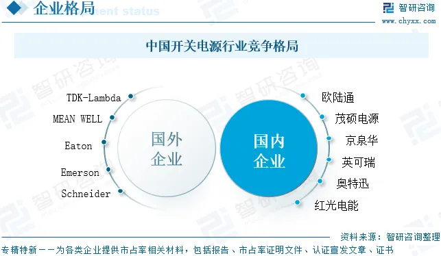 中国开关电源行业已形成国际化与本土化企业共同参与的竞争格局。国际市场由TDK-Lambda、MEAN WELL、伊顿、艾默生、施耐德等知名企业主导,这些公司凭借深厚的技术积累和全球化的市场布局,在高端产品领域占据重要地位。与此同时,国内企业如欧陆通、茂硕电源、京泉华、英可瑞、奥特迅、红光电能等正快速崛起,通过技术创新和成本优势不断提升市场竞争力。当前,国内外企业在中高端市场展开激烈竞争,本土企业在响应速度、定制化服务和性价比方面展现出独特优势。随着产业升级和技术进步,具备核心技术和规模优势的企业将持续扩大市场份额,推动行业向品牌化、高端化方向发展。