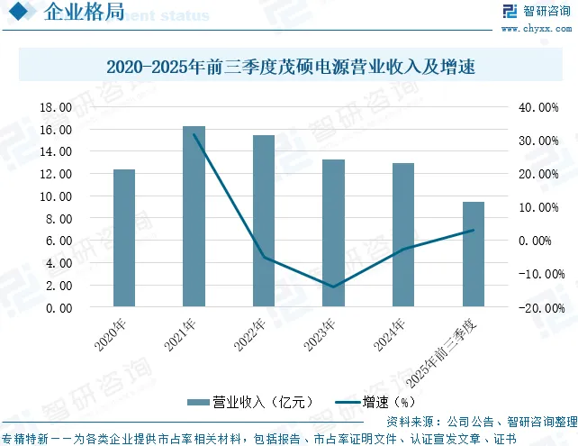 茂硕电源科技股份有限公司主要从事开关电源的研发、生产、销售和技术服务,致力于为客户提供高品质、高性价比的LED驱动电源与消费类电子电源。公司经营范围:LED智能驱动电源,太阳能光伏逆变器,DC/DC高效、高密度模块电源,医疗电源,通信电源,开关电源,高频变压器的研发和销售;电子元器件,五金塑胶配件的销售以及提供新能源和再生能源的储能系统解决方案(以上不含限制项目);经营进出口业务(法律、行政法规、国务院决定禁止的项目除外,限制的项目须取得许可后方可经营);房屋租赁;信息技术服务(不含限制项目);企业管理咨询(不含限制项目)。以上项目法律、行政法规、国务院决定禁止的项目除外,限制的项目须取得许可后方可经营,许可经营项目是:LED智能驱动电源,太阳能光伏逆变器,DC/DC高效、高密度模块电源,医疗电源,通信电源,开关电源,高频变压器的生产;普通货运。从企业经营情况来看,2025年前三季度,茂硕电源营业收入为9.45亿元,同比增长2.95%。