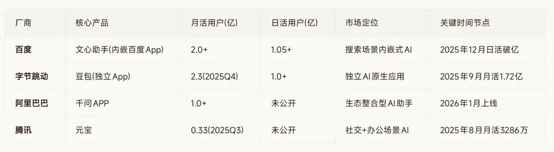 注:用户数据为公开披露或第三方机构估算,实际数据可能因统计口径不同存在差异。百度文心助手因内嵌于百度App(月活超7亿),用户获取门槛最低;字节豆包作为独立App率先实现日活破亿;阿里千问APP上线不足两个月实现月活破亿,增长迅猛;腾讯元宝用户基数相对较小但增速较快。