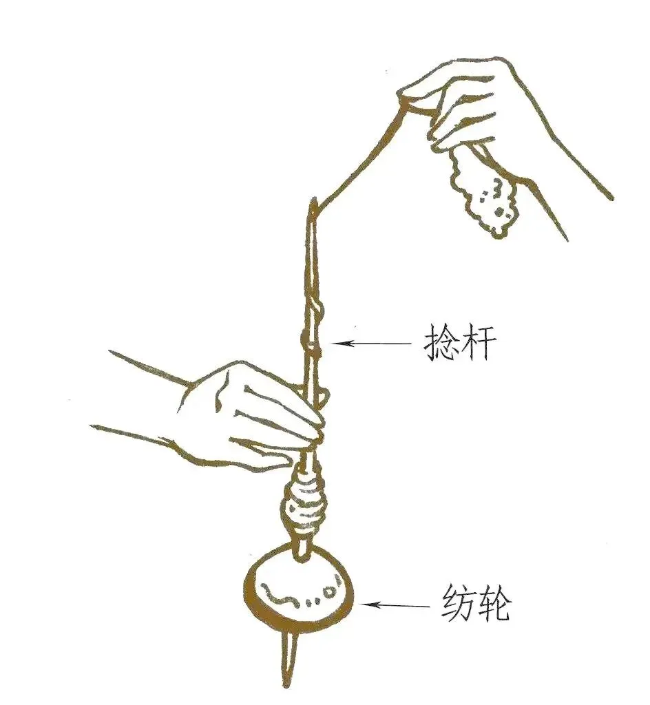【说明】:母指肚1为纺轮捻杆,母指背0为纺轮中央孔洞,将捻杆1插入纺轮中央孔洞即可。