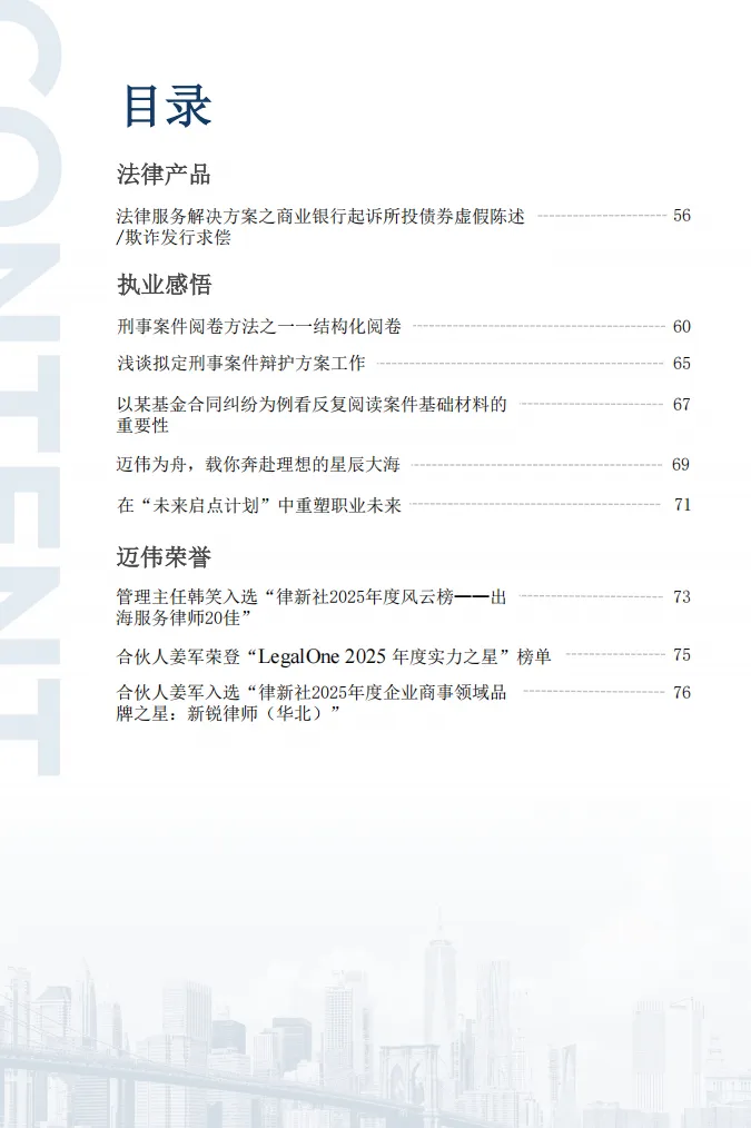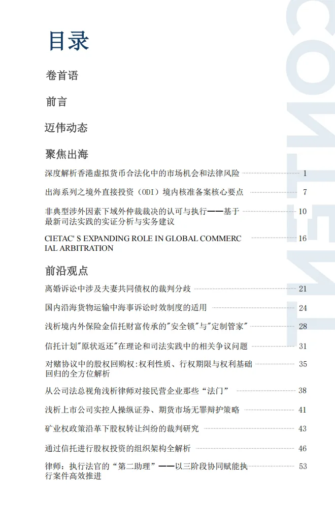 北京迈伟律师事务所重磅推出年刊,精准聚焦业务出海、前沿观点等关键领域,涵盖迈伟出海、动态、矿产、刑事、信托、医疗数据资产合规等丰富内容。
