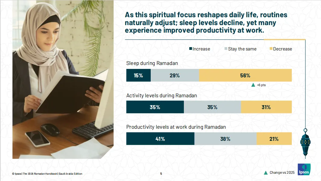 数据是这样的:五国平均55%以上的人表示斋月期间睡眠显著减少。更反直觉的是,沙特有41%的受访者说,他们在斋月的工作效率反而提高了。