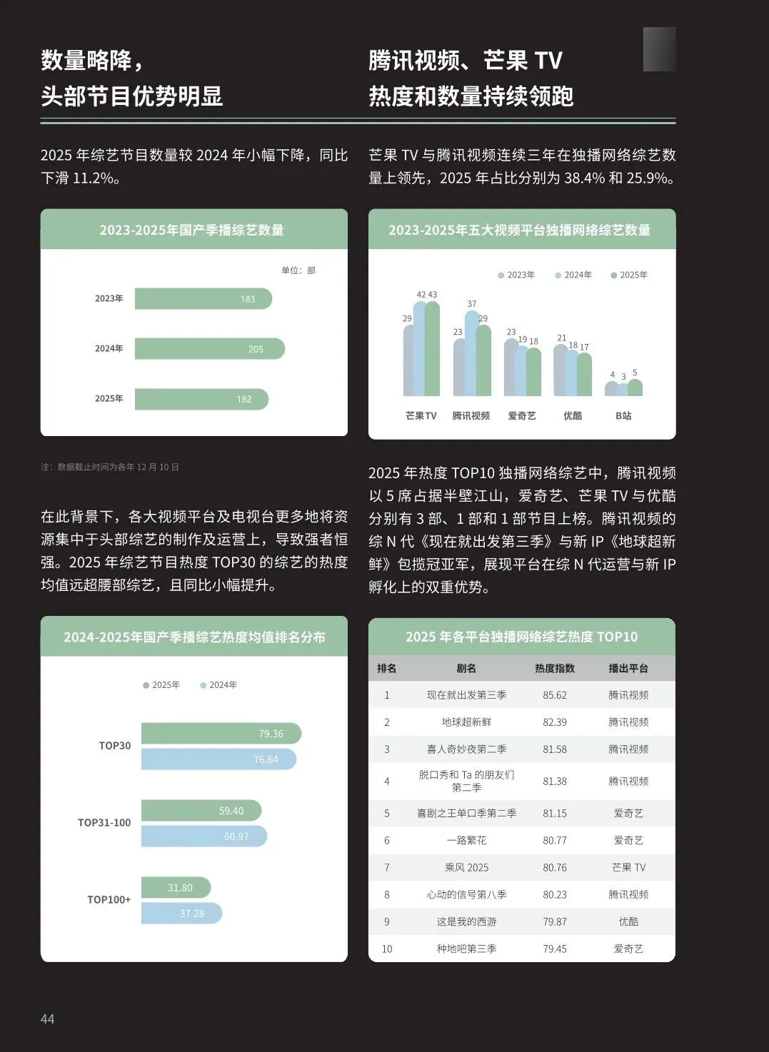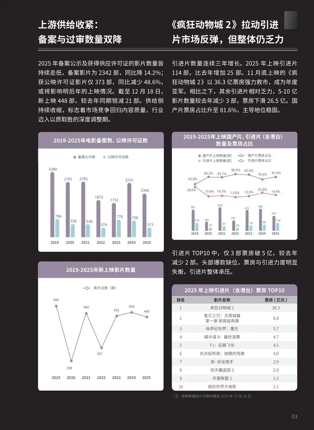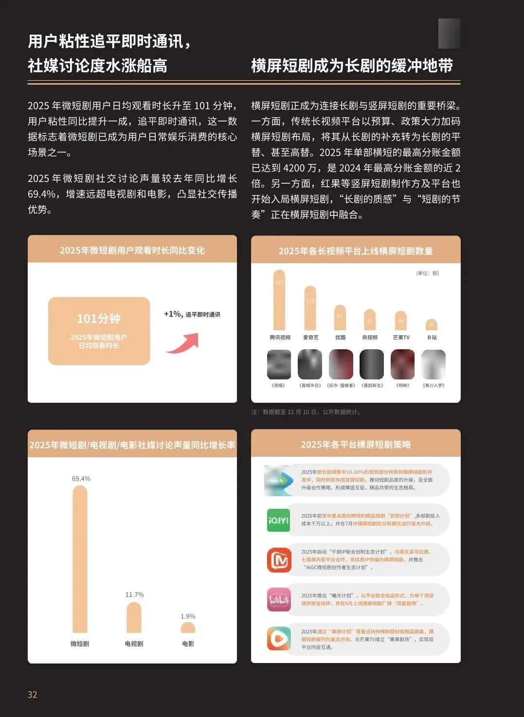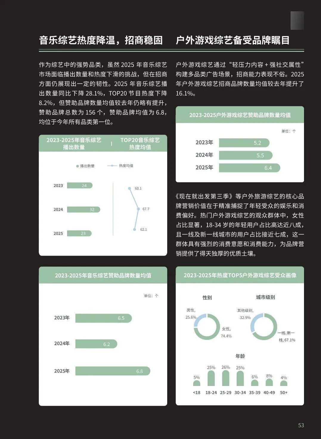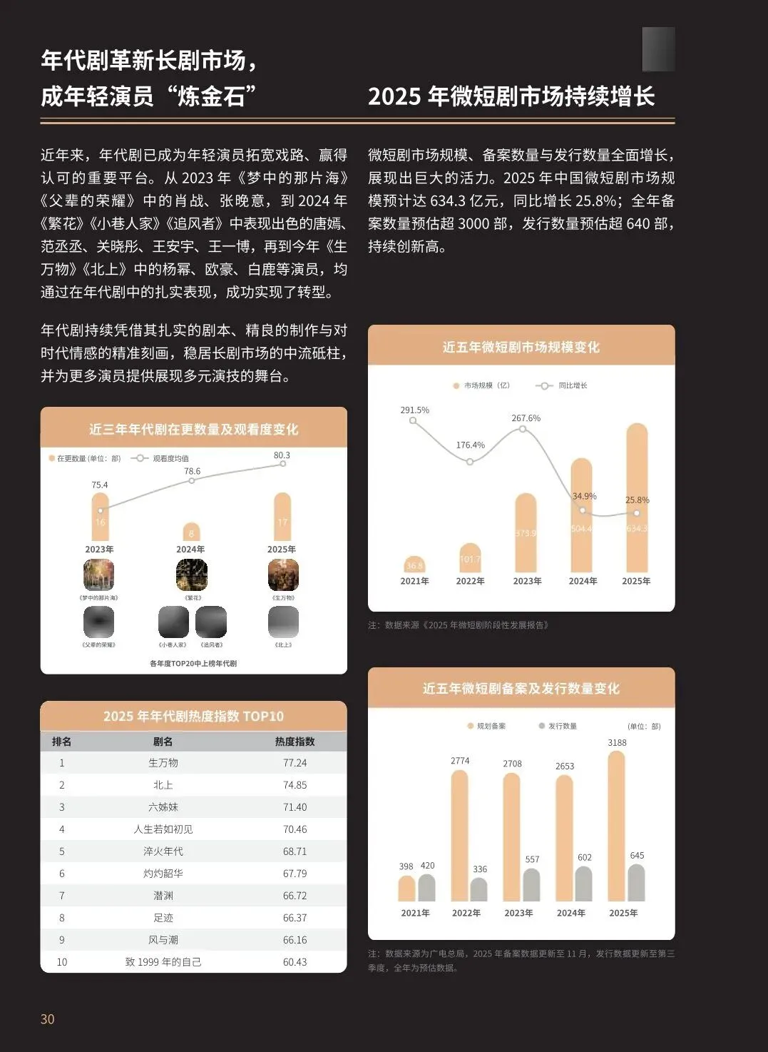 2025 年娱乐行业呈现多元分化与结构性升级特征,电影市场总票房达 518.3 亿元,《哪吒之魔童闹海》以 154.5 亿元刷新影史纪录,动画与战争题材成为核心驱动力,但供给端备案与过审数量双降,腰部影片失血导致结构失衡。剧集市场长剧供给收缩,高口碑作品占比下滑,古装剧仍是基本盘但热度回落,微短剧则迎来爆发式增长,市场规模预计达 634.3 亿元,用户日均观看时长追平即时通讯,横屏短剧向长剧质感靠拢,竖屏短剧进入免费时代。综艺市场数量小幅下降但头部效应凸显,综 N 代占据热度与口碑榜主导,女性议题、海外录制成为创新亮点,户外游戏与喜剧综艺招商表现强劲。
