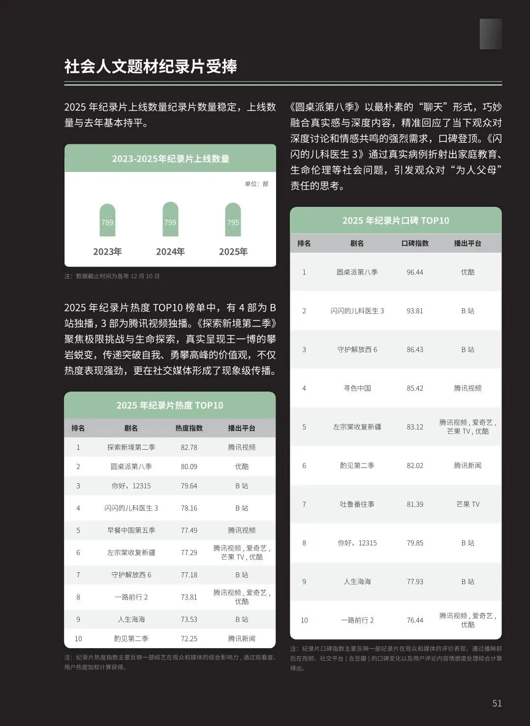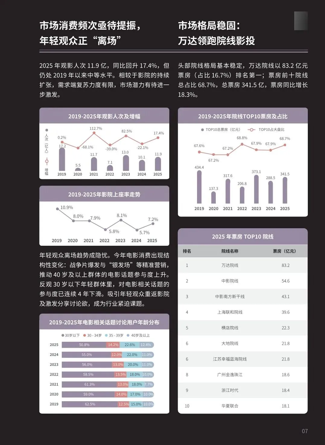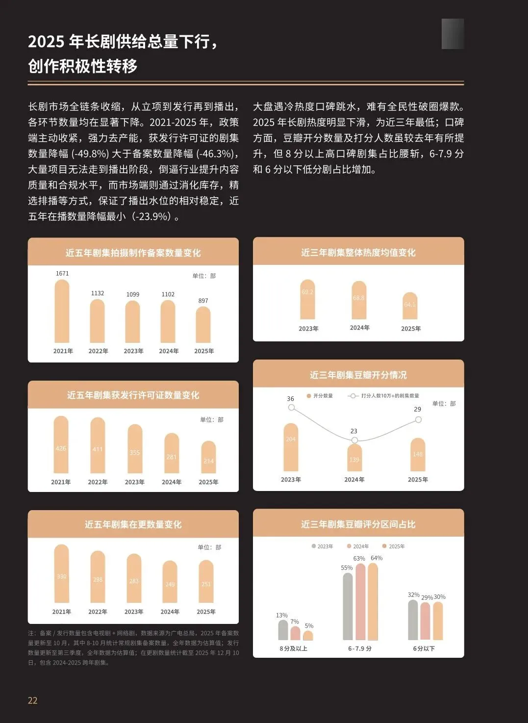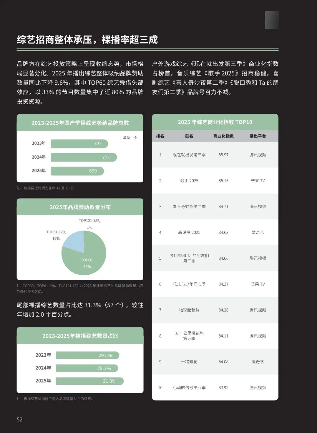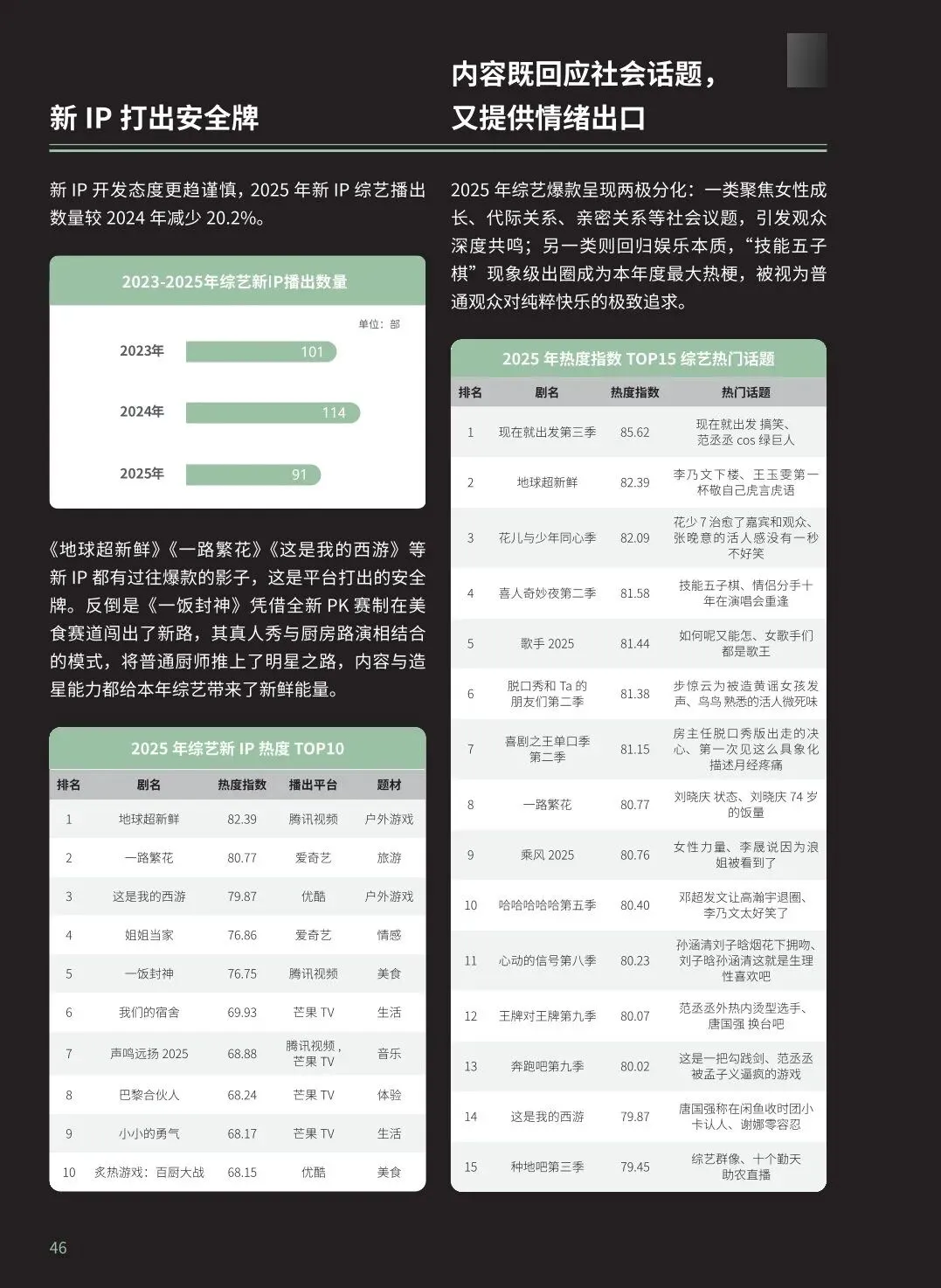 2025 年娱乐行业呈现多元分化与结构性升级特征,电影市场总票房达 518.3 亿元,《哪吒之魔童闹海》以 154.5 亿元刷新影史纪录,动画与战争题材成为核心驱动力,但供给端备案与过审数量双降,腰部影片失血导致结构失衡。剧集市场长剧供给收缩,高口碑作品占比下滑,古装剧仍是基本盘但热度回落,微短剧则迎来爆发式增长,市场规模预计达 634.3 亿元,用户日均观看时长追平即时通讯,横屏短剧向长剧质感靠拢,竖屏短剧进入免费时代。综艺市场数量小幅下降但头部效应凸显,综 N 代占据热度与口碑榜主导,女性议题、海外录制成为创新亮点,户外游戏与喜剧综艺招商表现强劲。