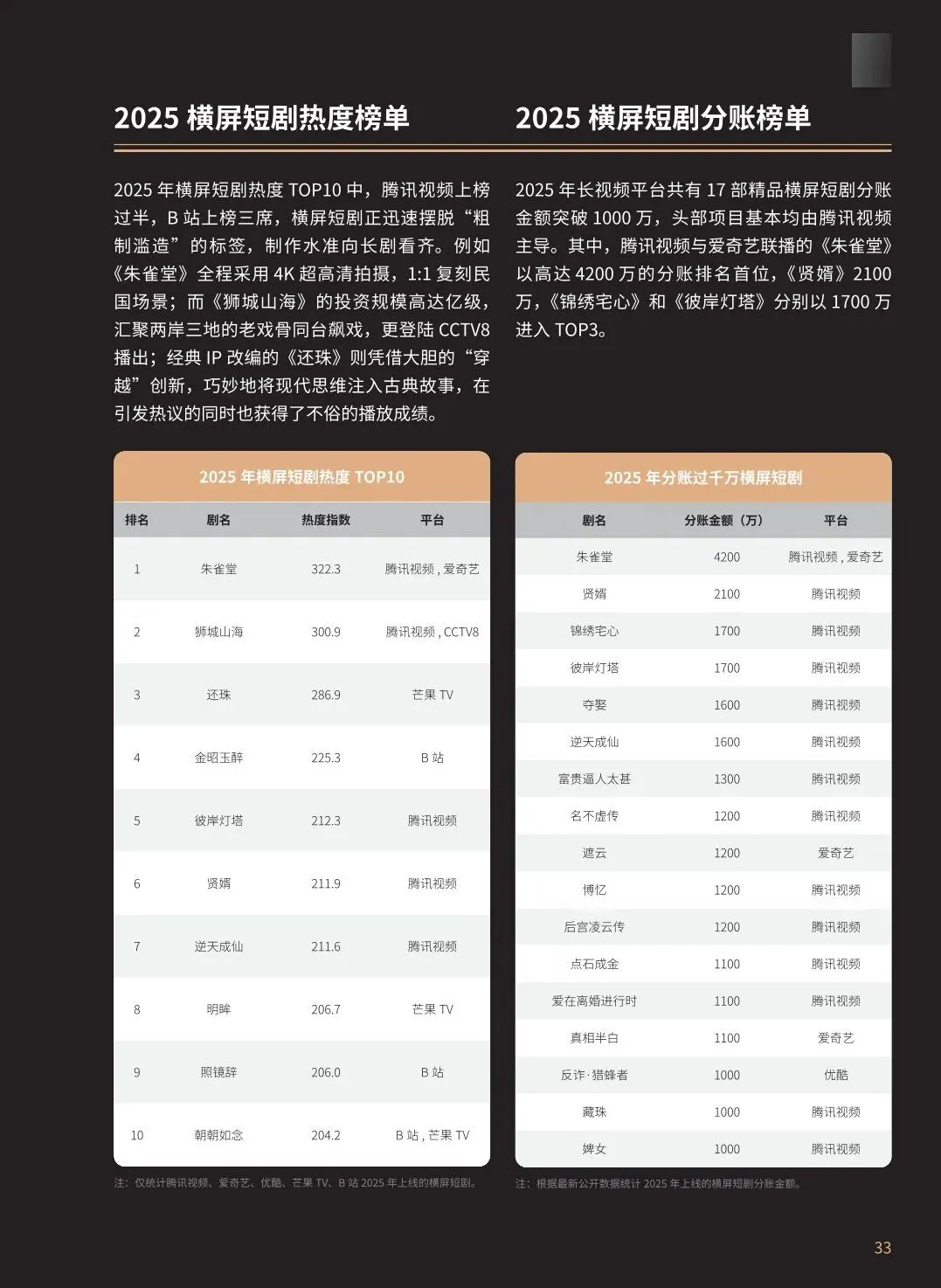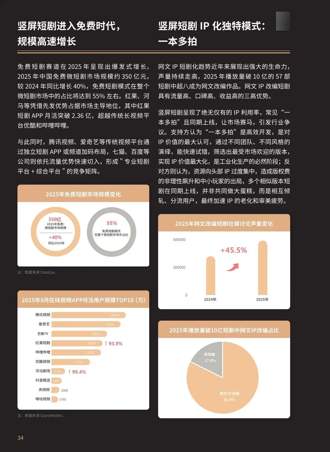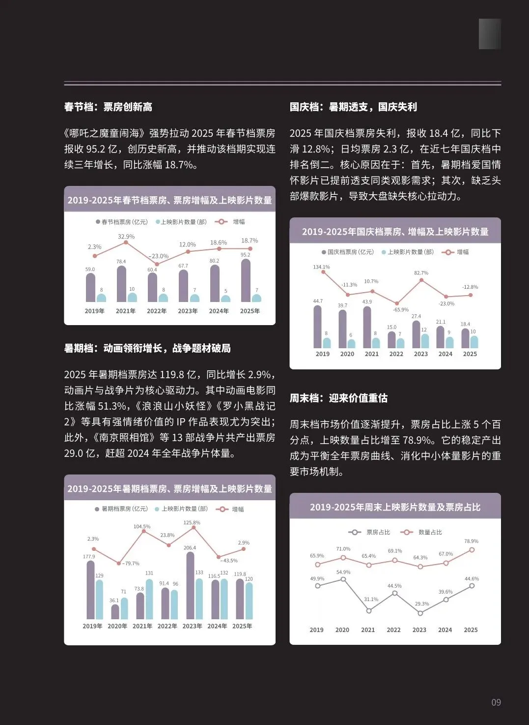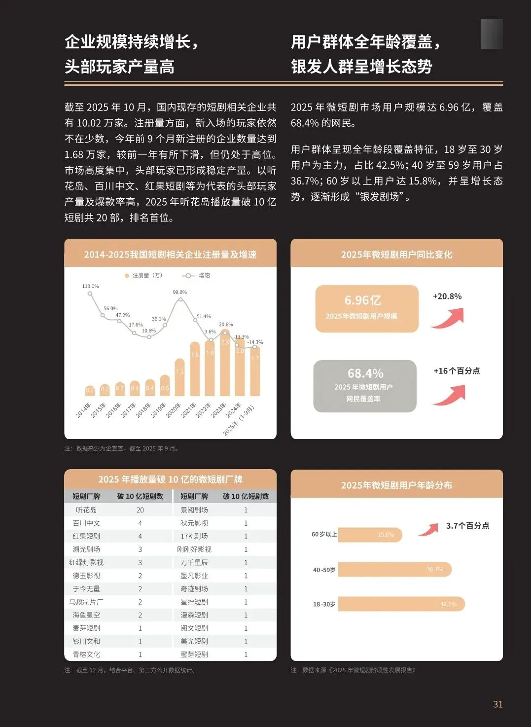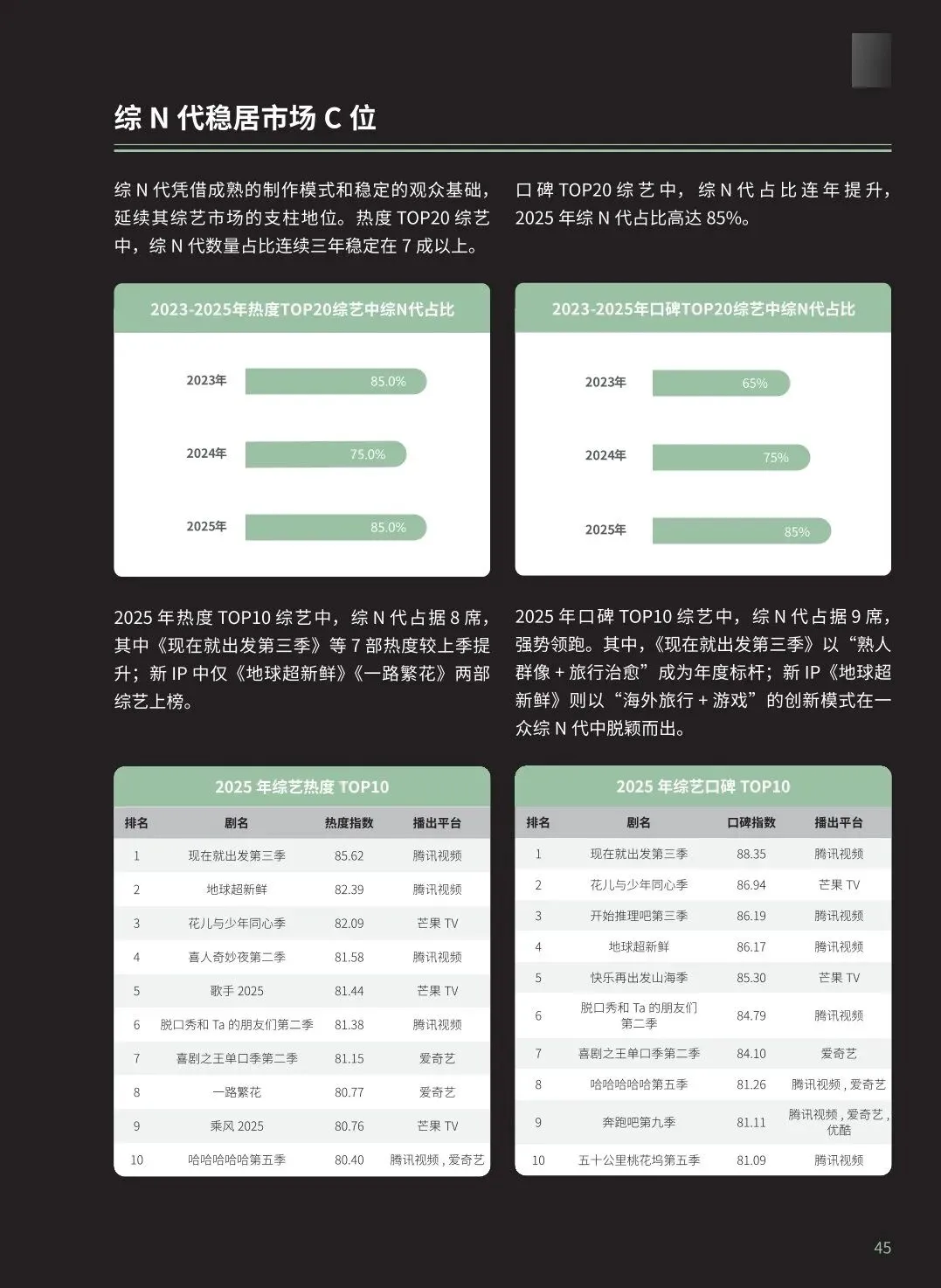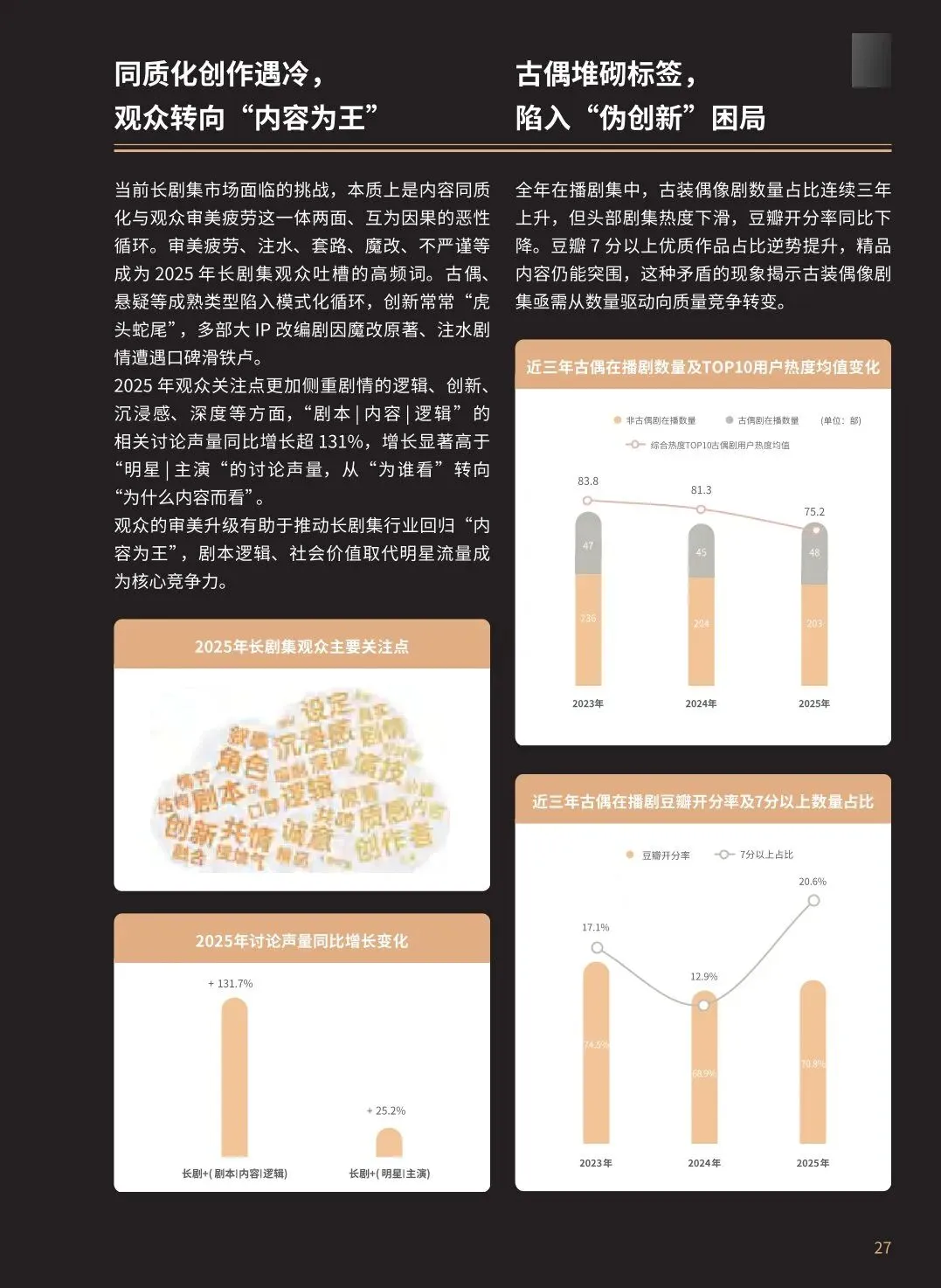 2025 年娱乐行业呈现多元分化与结构性升级特征,电影市场总票房达 518.3 亿元,《哪吒之魔童闹海》以 154.5 亿元刷新影史纪录,动画与战争题材成为核心驱动力,但供给端备案与过审数量双降,腰部影片失血导致结构失衡。剧集市场长剧供给收缩,高口碑作品占比下滑,古装剧仍是基本盘但热度回落,微短剧则迎来爆发式增长,市场规模预计达 634.3 亿元,用户日均观看时长追平即时通讯,横屏短剧向长剧质感靠拢,竖屏短剧进入免费时代。综艺市场数量小幅下降但头部效应凸显,综 N 代占据热度与口碑榜主导,女性议题、海外录制成为创新亮点,户外游戏与喜剧综艺招商表现强劲。