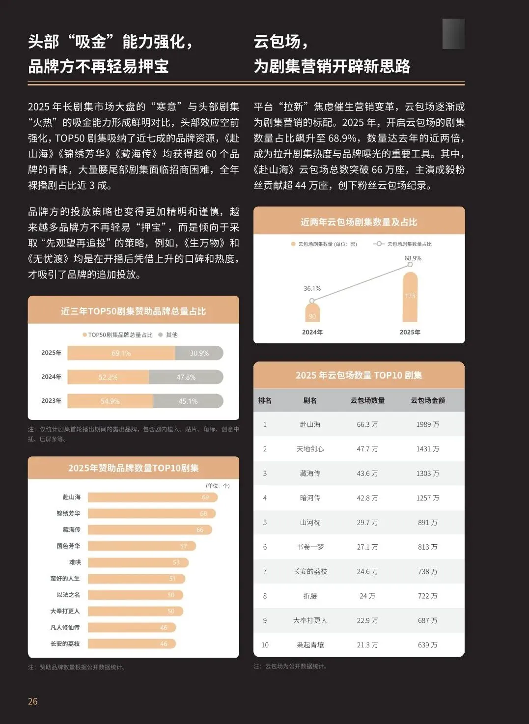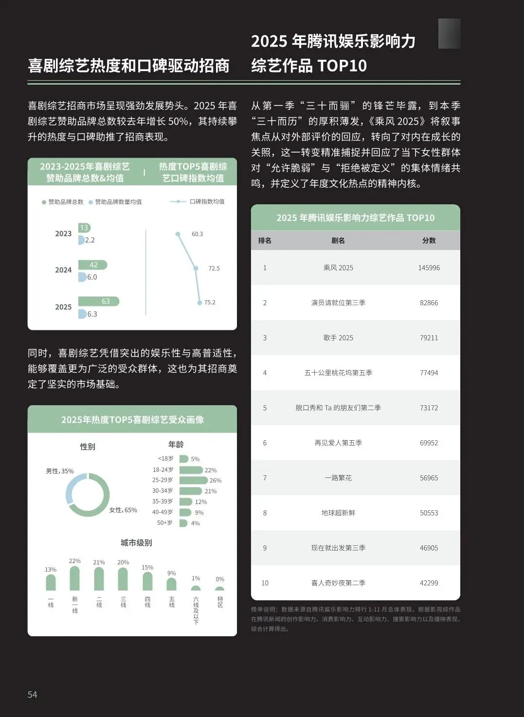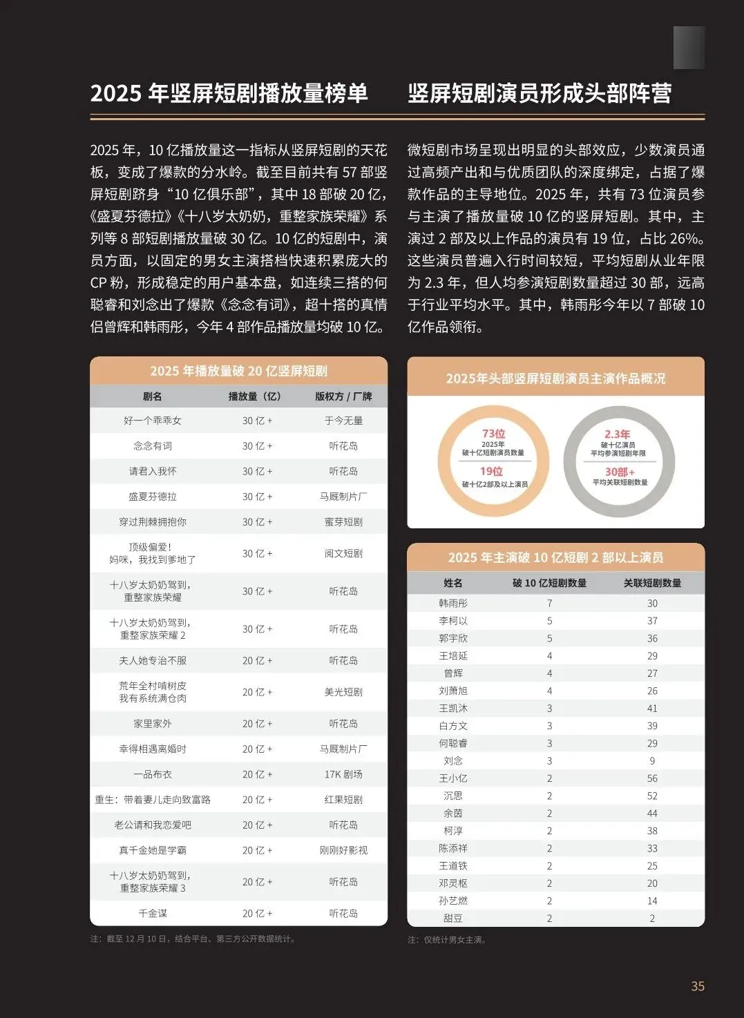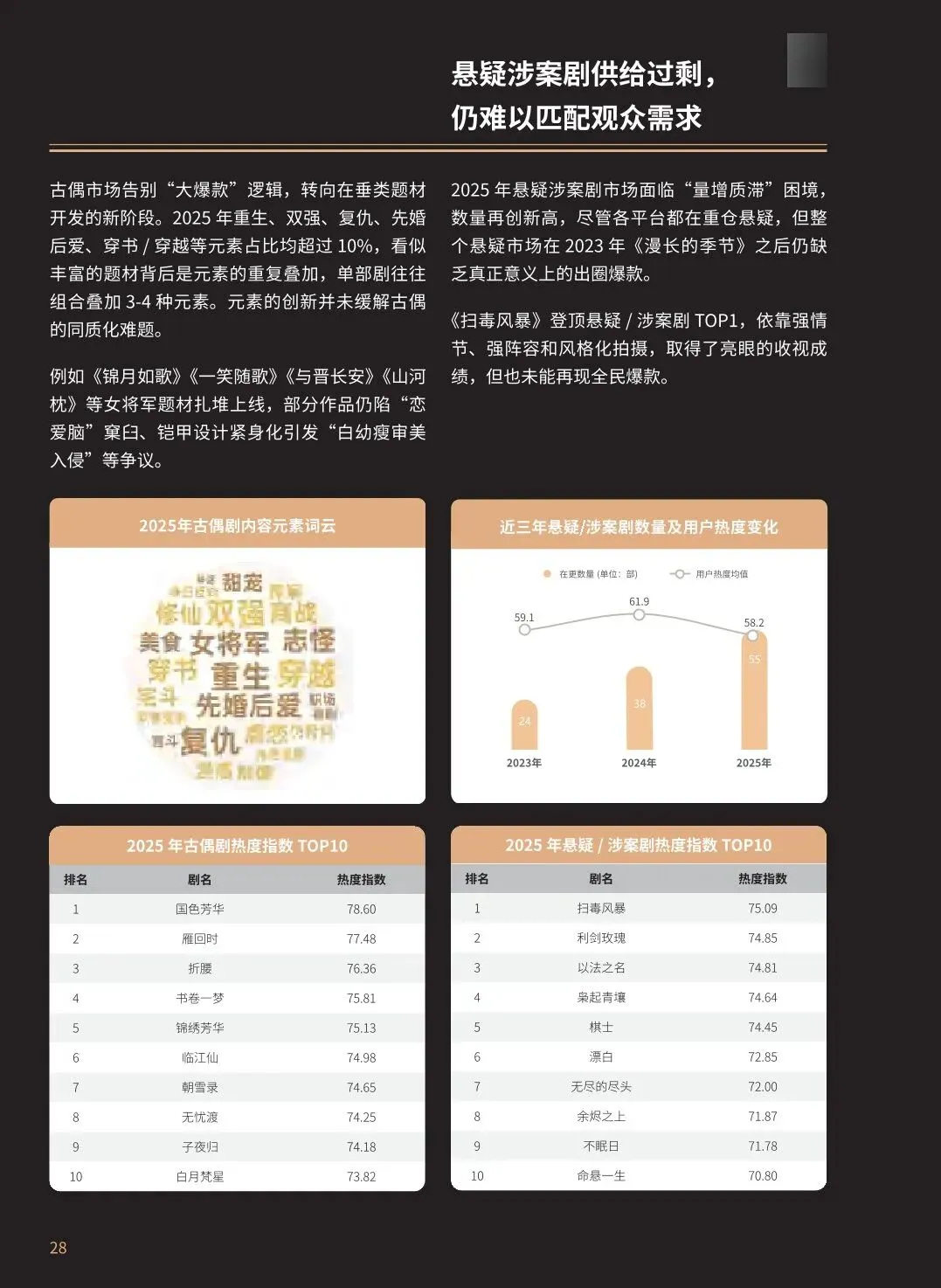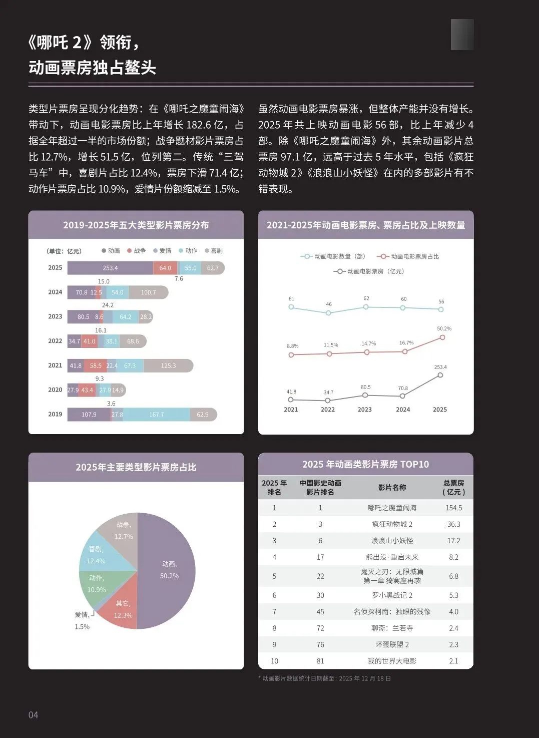 2025 年娱乐行业呈现多元分化与结构性升级特征,电影市场总票房达 518.3 亿元,《哪吒之魔童闹海》以 154.5 亿元刷新影史纪录,动画与战争题材成为核心驱动力,但供给端备案与过审数量双降,腰部影片失血导致结构失衡。剧集市场长剧供给收缩,高口碑作品占比下滑,古装剧仍是基本盘但热度回落,微短剧则迎来爆发式增长,市场规模预计达 634.3 亿元,用户日均观看时长追平即时通讯,横屏短剧向长剧质感靠拢,竖屏短剧进入免费时代。综艺市场数量小幅下降但头部效应凸显,综 N 代占据热度与口碑榜主导,女性议题、海外录制成为创新亮点,户外游戏与喜剧综艺招商表现强劲。