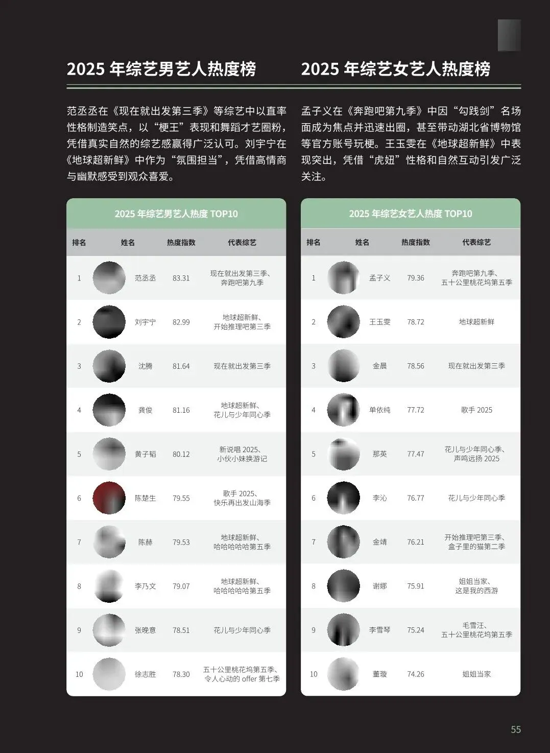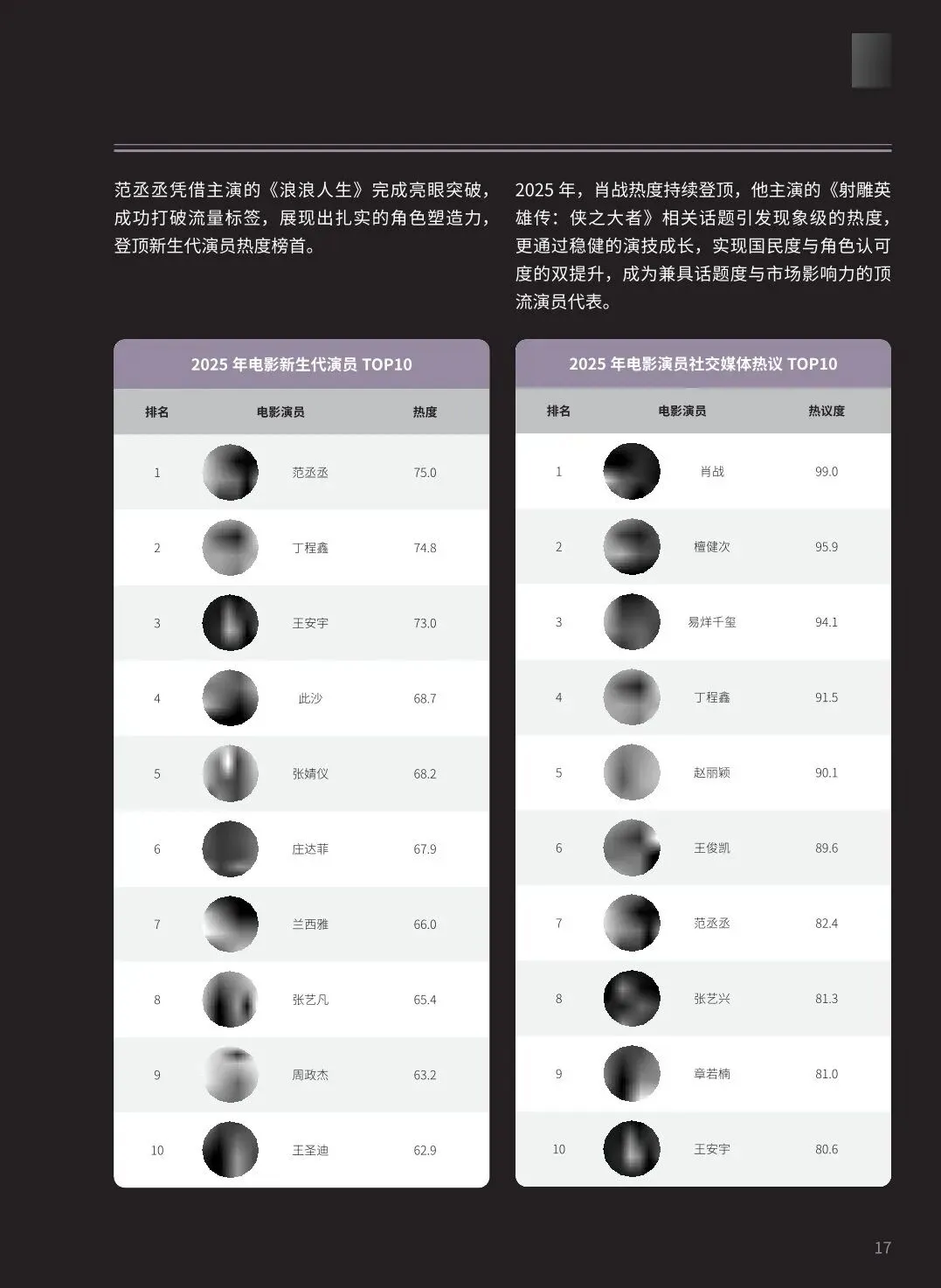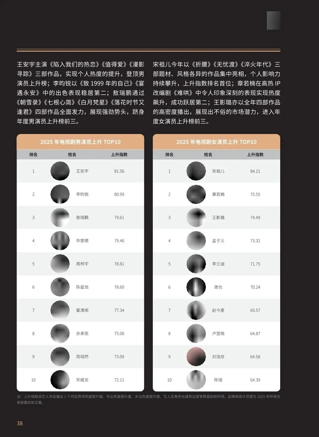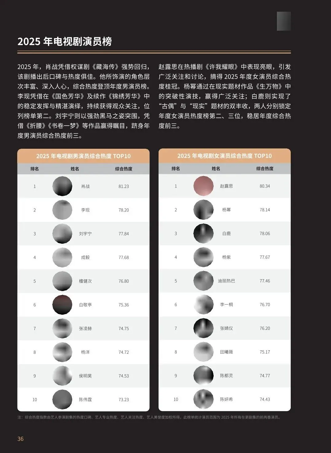 明星生态呈现多重变革,流量演员加速向实力派转型,杨幂、赵丽颖等通过现实主义题材与年代剧实现口碑突破,中年实力派与新生代演员各有亮点。中腰部明星 “网红化” 生存成为常态,通过短视频平台高频互动圈粉;60 岁以上艺人价值重估,女性艺人通过综艺、短剧多元激活热度,男性艺人则多聚焦传统影视领域。明星公益从 “一次性” 转向 “专题化”,肖战、王一博等持续深耕公益获得高关注度,而负面舆情成为明星热度下滑的主要诱因,流量价值退潮导致艺人生命周期缩短。