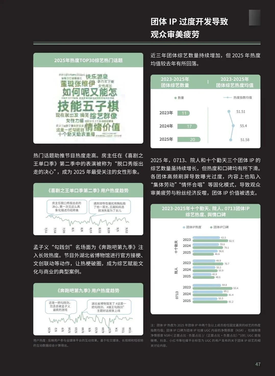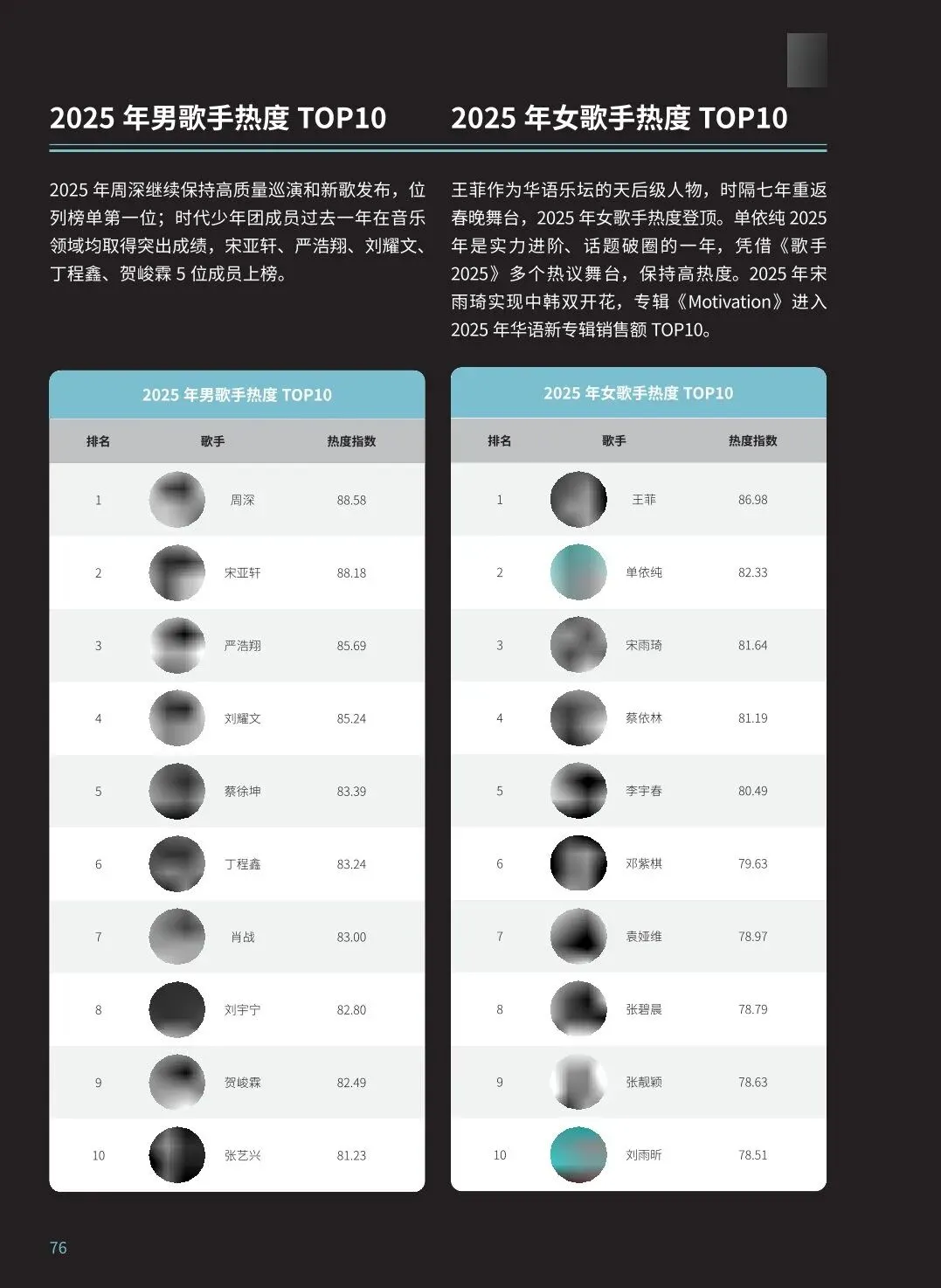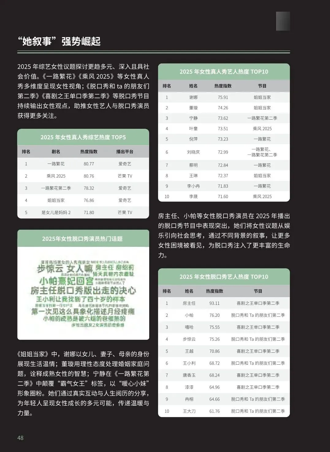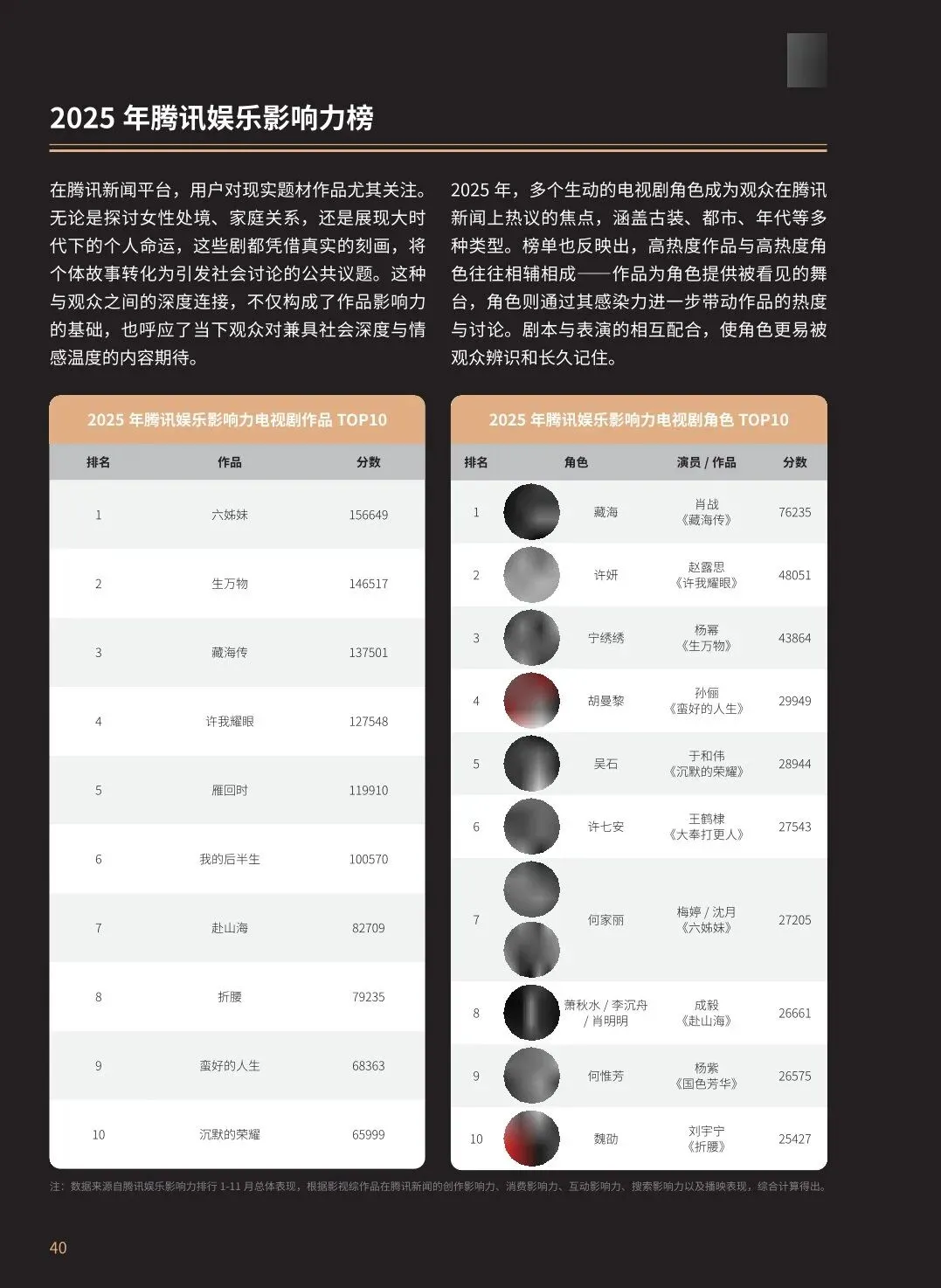 明星生态呈现多重变革,流量演员加速向实力派转型,杨幂、赵丽颖等通过现实主义题材与年代剧实现口碑突破,中年实力派与新生代演员各有亮点。中腰部明星 “网红化” 生存成为常态,通过短视频平台高频互动圈粉;60 岁以上艺人价值重估,女性艺人通过综艺、短剧多元激活热度,男性艺人则多聚焦传统影视领域。明星公益从 “一次性” 转向 “专题化”,肖战、王一博等持续深耕公益获得高关注度,而负面舆情成为明星热度下滑的主要诱因,流量价值退潮导致艺人生命周期缩短。