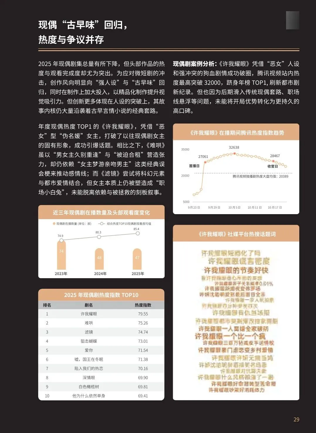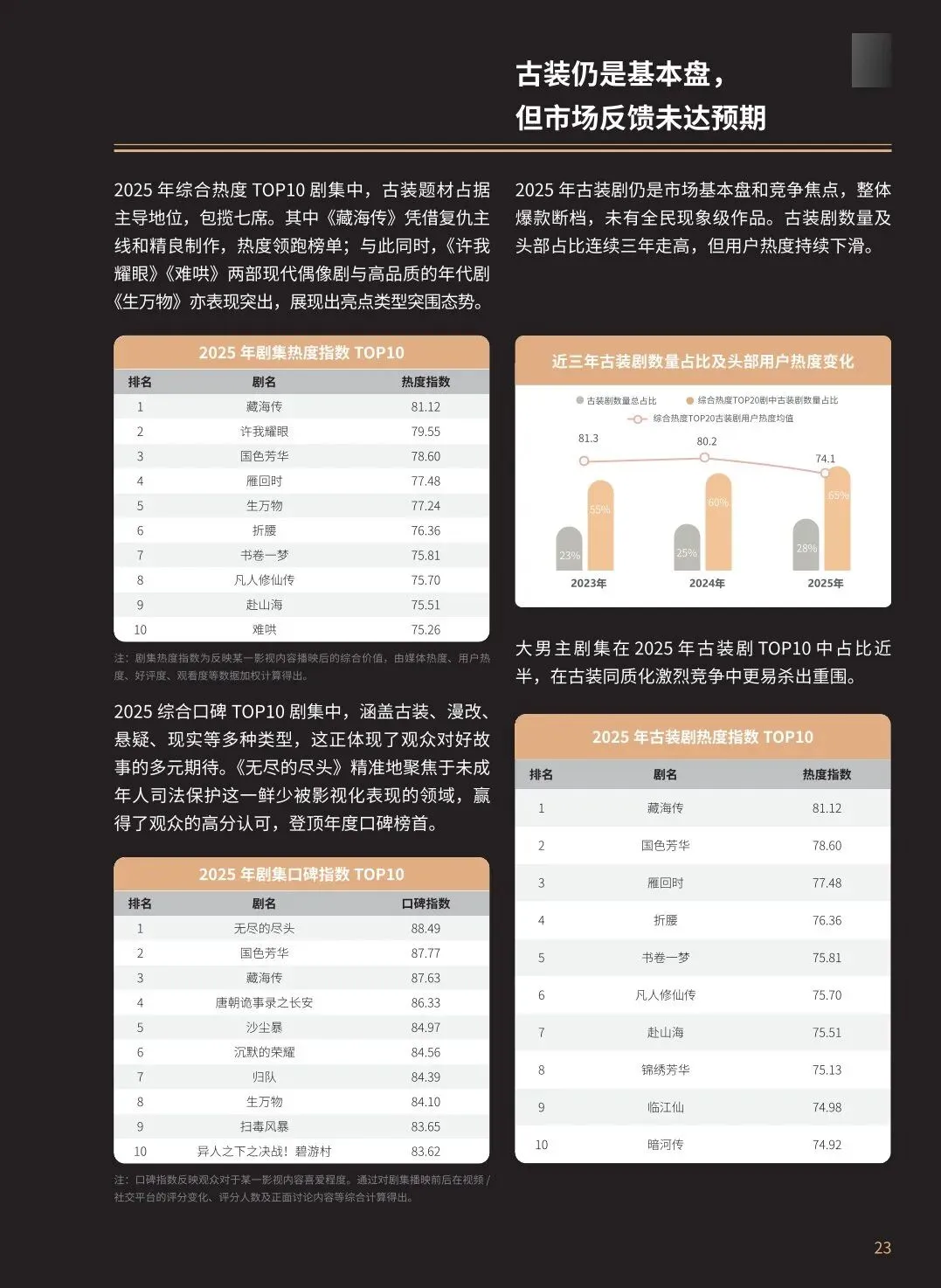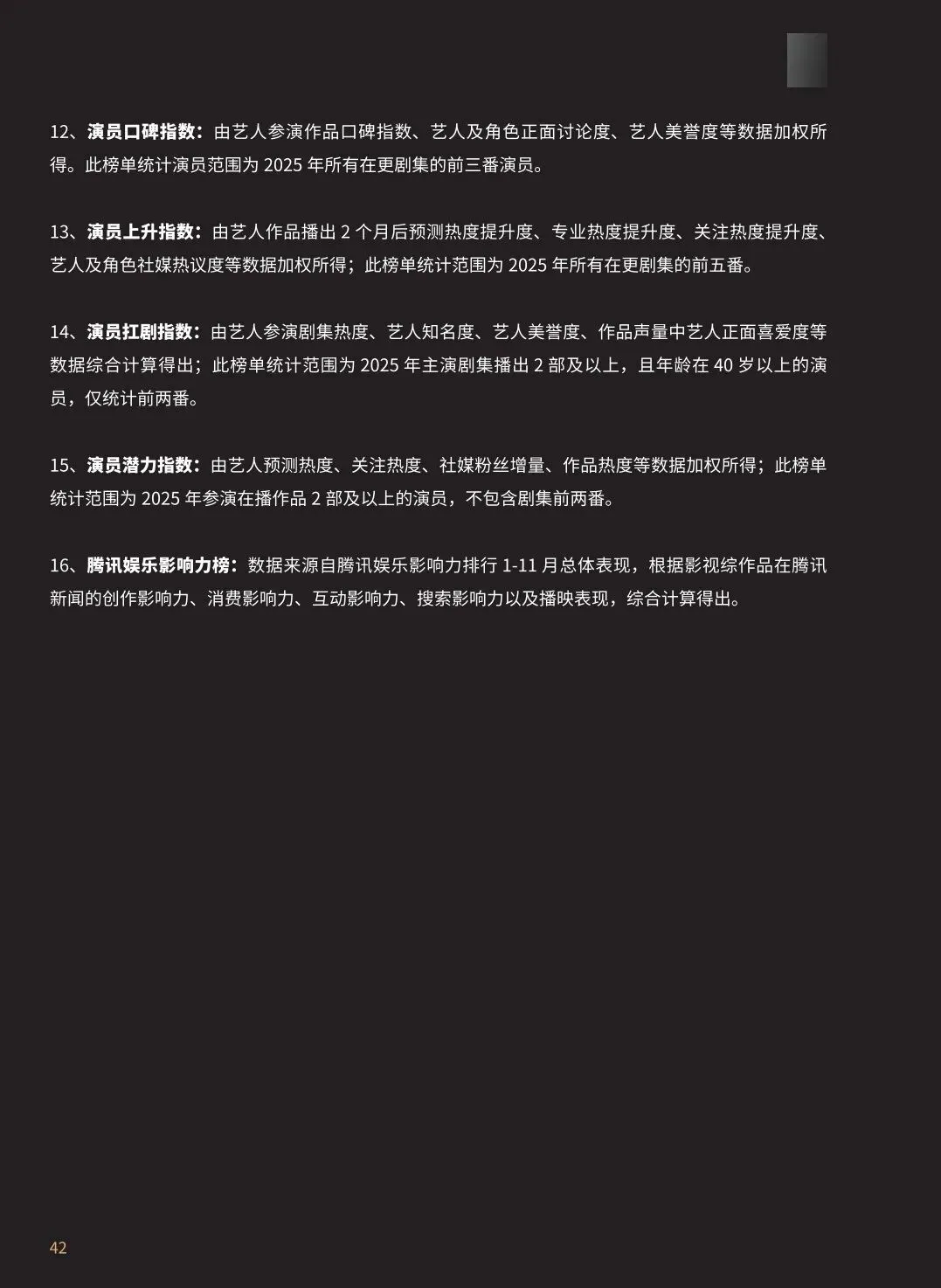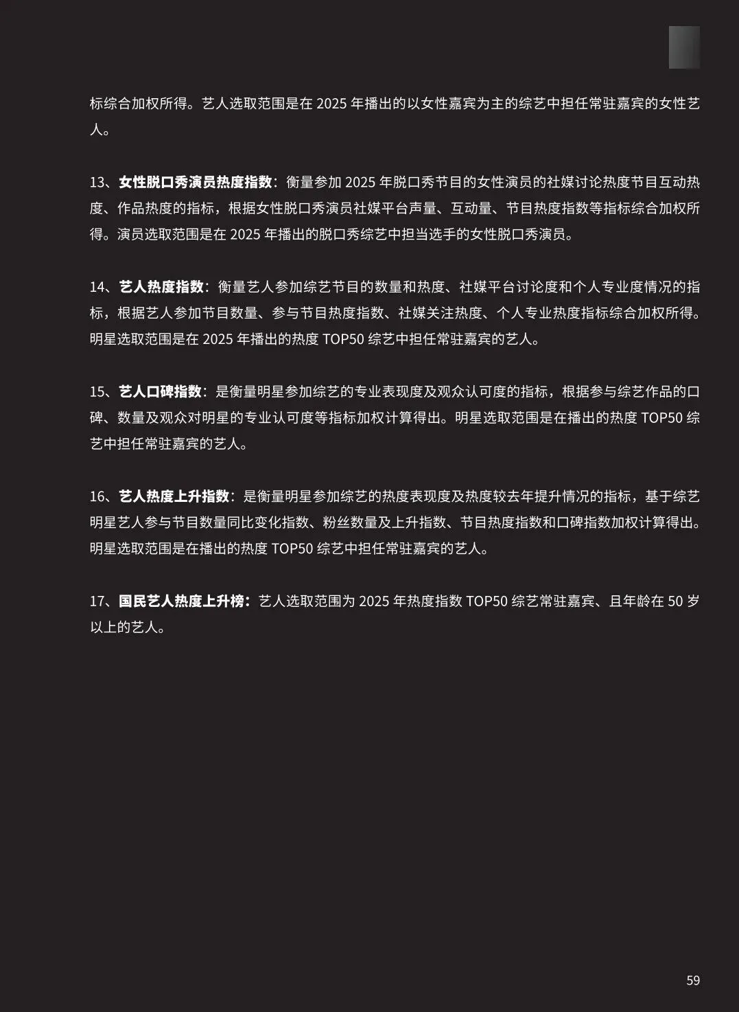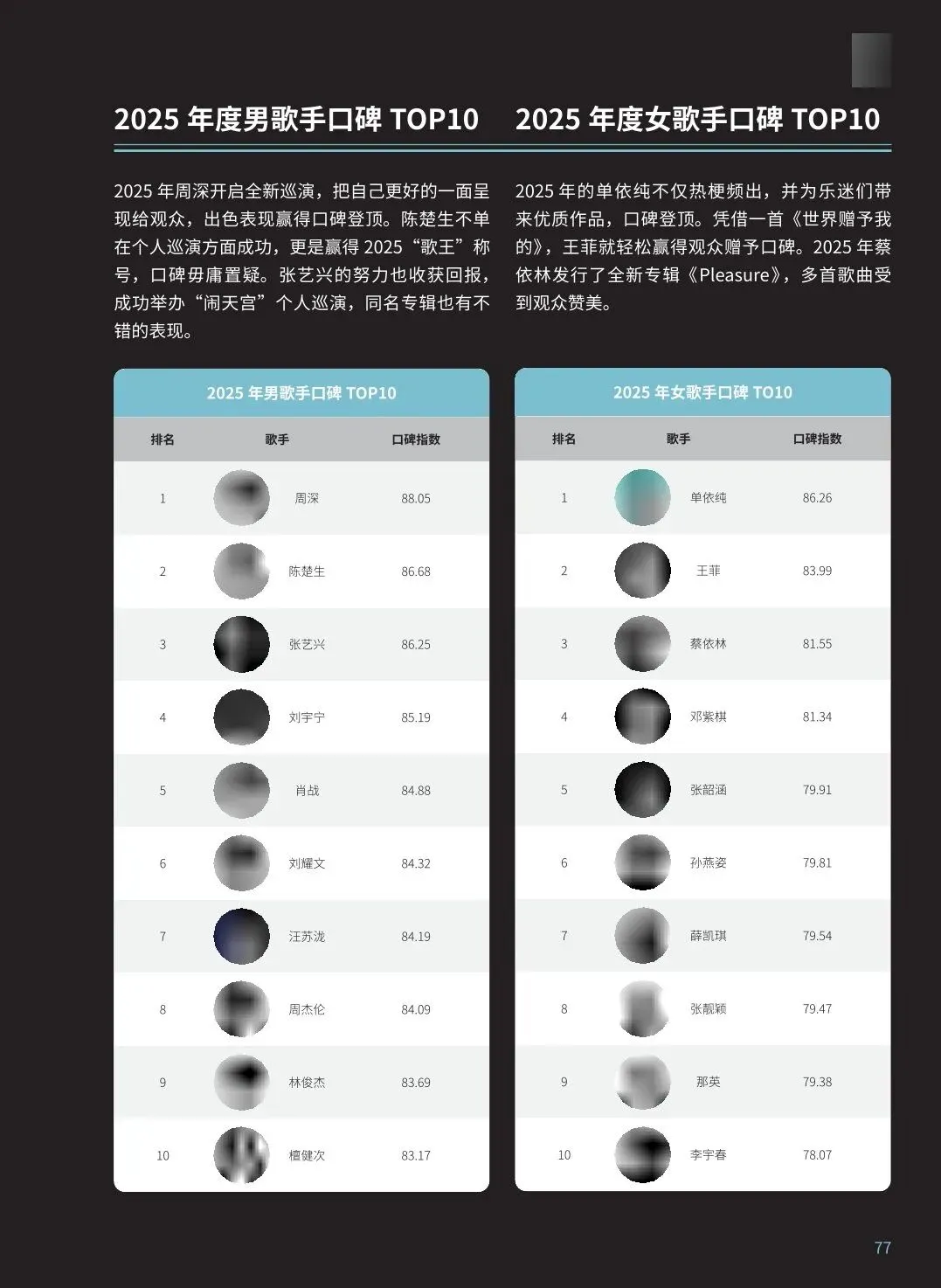 明星生态呈现多重变革,流量演员加速向实力派转型,杨幂、赵丽颖等通过现实主义题材与年代剧实现口碑突破,中年实力派与新生代演员各有亮点。中腰部明星 “网红化” 生存成为常态,通过短视频平台高频互动圈粉;60 岁以上艺人价值重估,女性艺人通过综艺、短剧多元激活热度,男性艺人则多聚焦传统影视领域。明星公益从 “一次性” 转向 “专题化”,肖战、王一博等持续深耕公益获得高关注度,而负面舆情成为明星热度下滑的主要诱因,流量价值退潮导致艺人生命周期缩短。