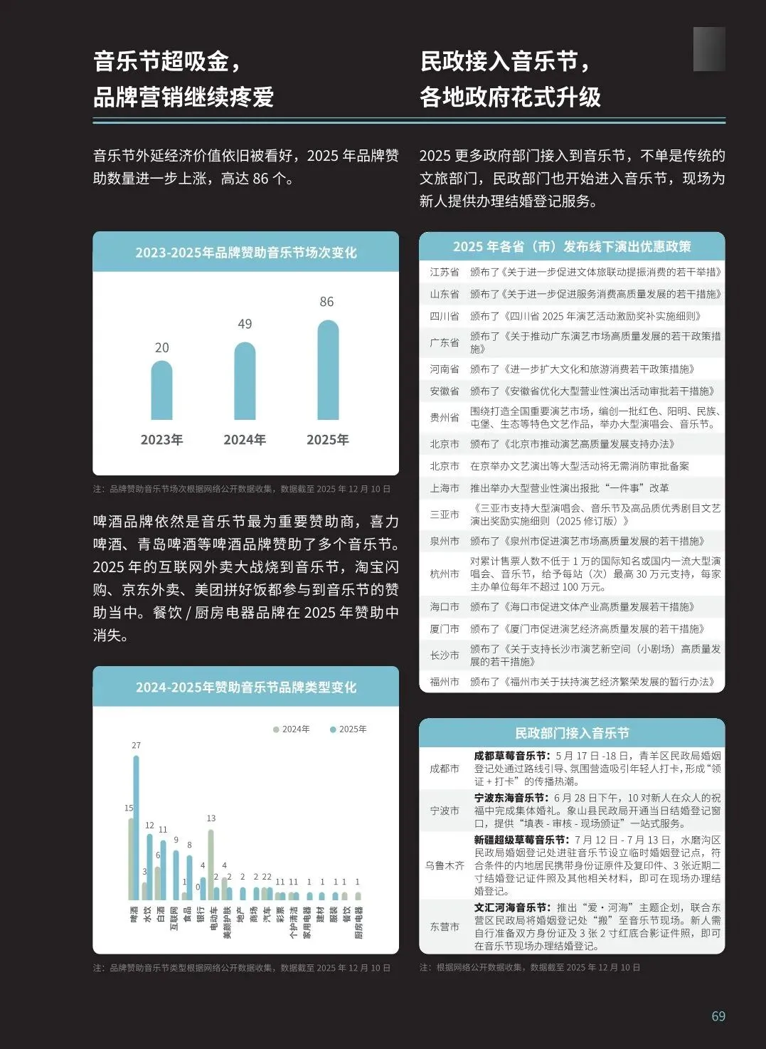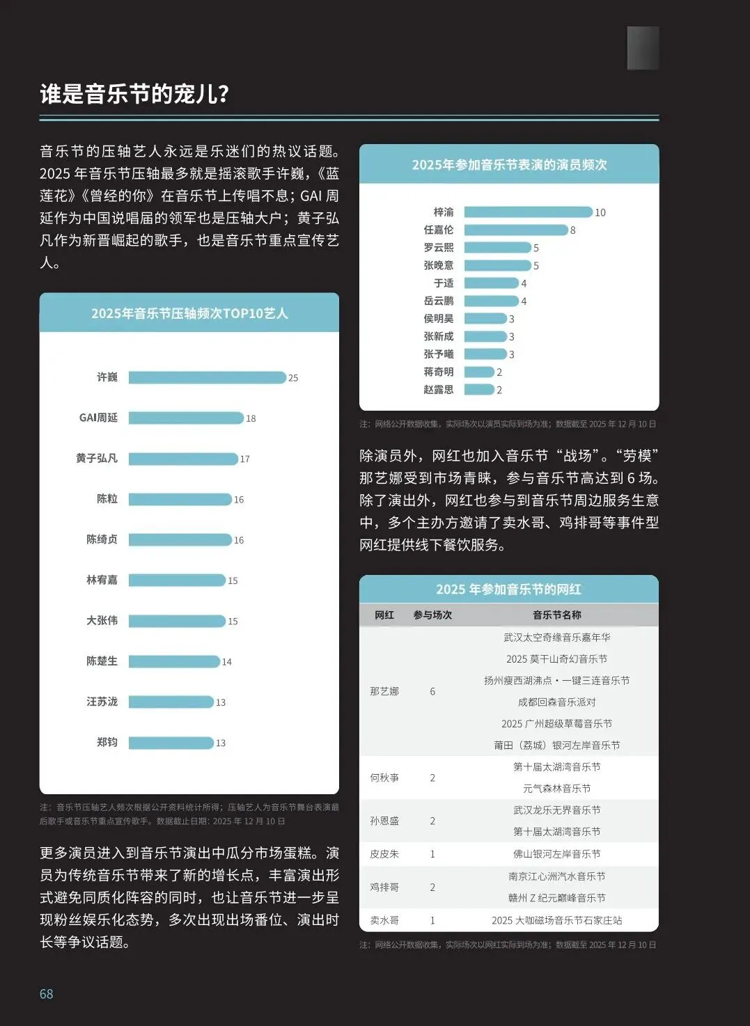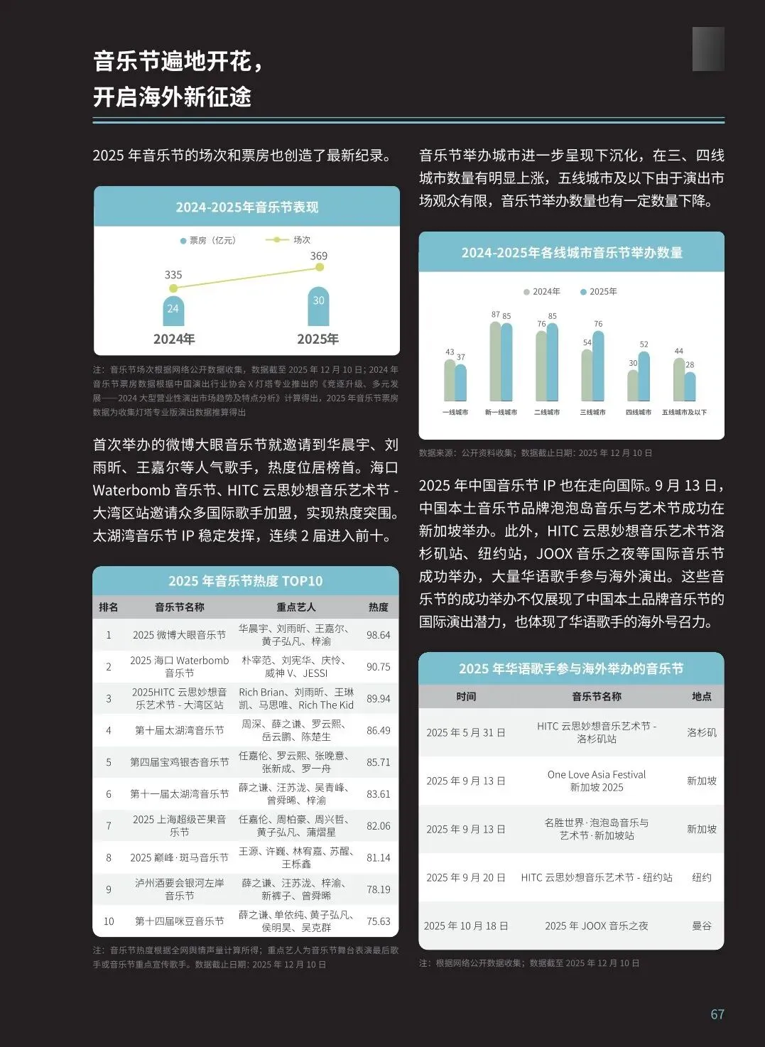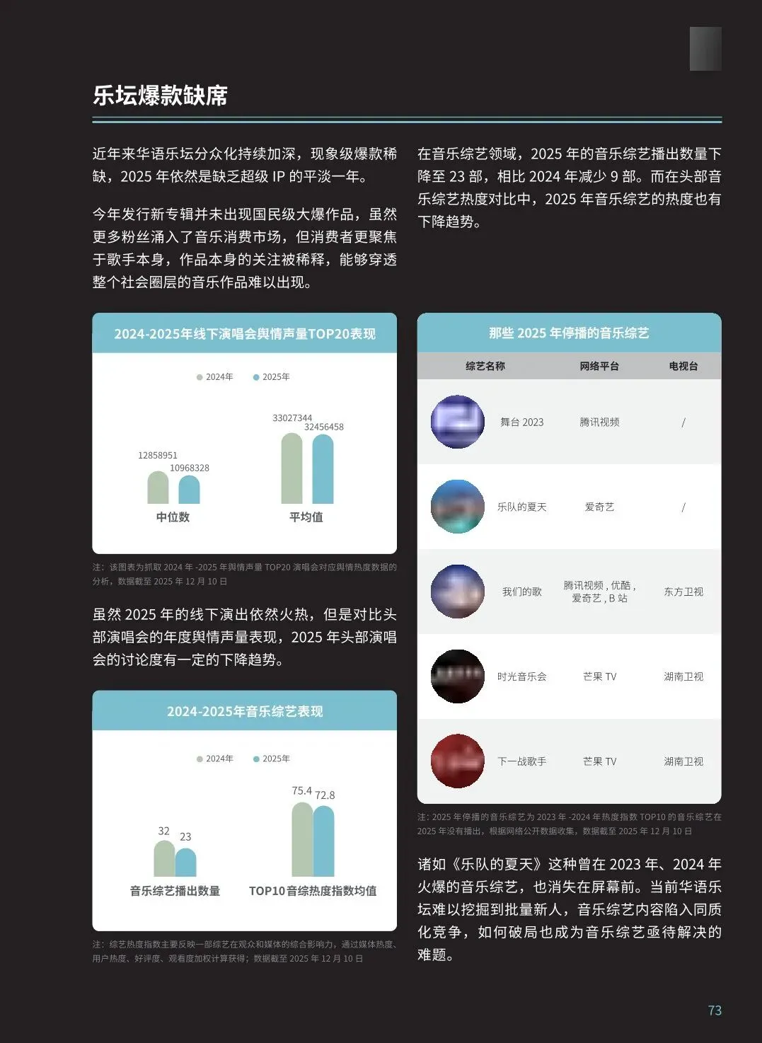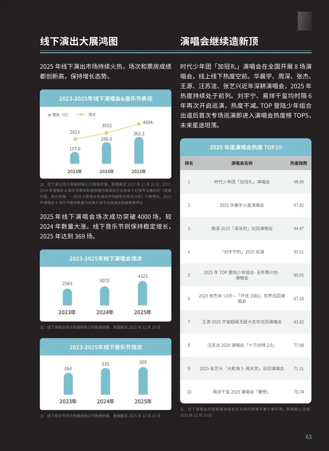 线下演出市场持续火热,演唱会与音乐节场次、票房均创历史新高,时代少年团、华晨宇等头部艺人巡演场场秒光,周杰伦、张杰等歌手的票务 “想看人数” 破千万,一线及新一线城市成为核心举办地。音乐领域数字音乐市场规模稳步增长,但现象级爆款缺席,音综播出数量下滑,部分经典 IP 停播,“抽象玩梗” 成为营销新风潮。同时,艺人跨界演出趋势明显,大量演员、网红涌入音乐节,带动粉丝消费与地方经济,政府部门也积极参与,民政部门甚至在音乐节现场提供结婚登记服务。