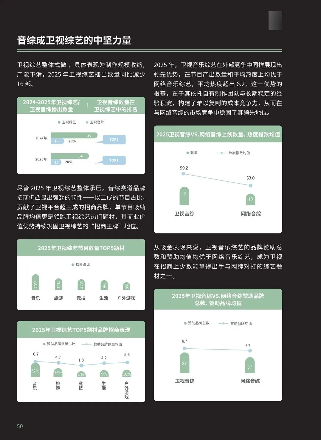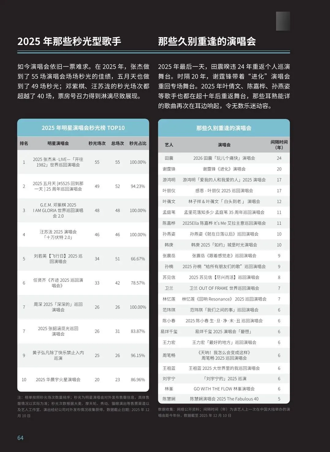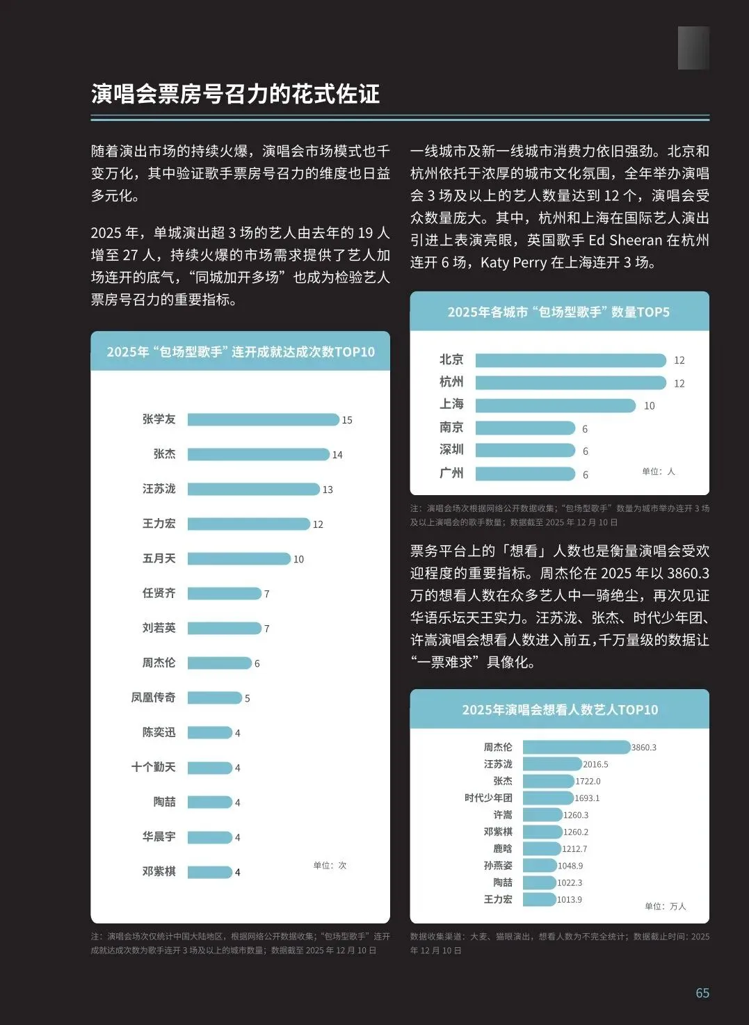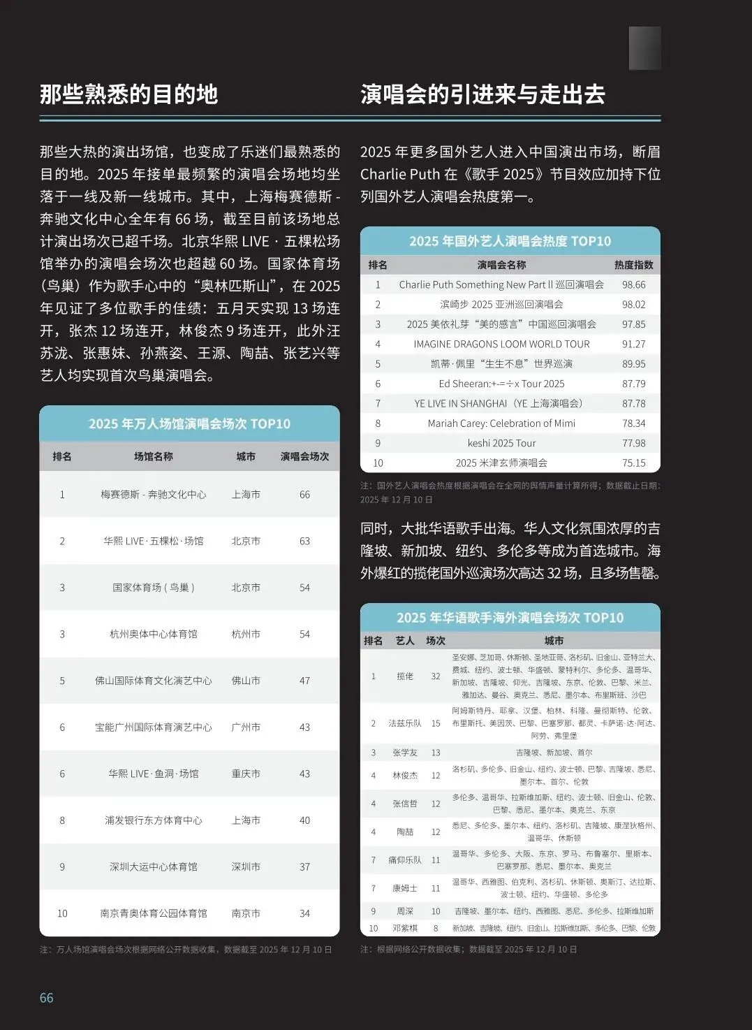 线下演出市场持续火热,演唱会与音乐节场次、票房均创历史新高,时代少年团、华晨宇等头部艺人巡演场场秒光,周杰伦、张杰等歌手的票务 “想看人数” 破千万,一线及新一线城市成为核心举办地。音乐领域数字音乐市场规模稳步增长,但现象级爆款缺席,音综播出数量下滑,部分经典 IP 停播,“抽象玩梗” 成为营销新风潮。同时,艺人跨界演出趋势明显,大量演员、网红涌入音乐节,带动粉丝消费与地方经济,政府部门也积极参与,民政部门甚至在音乐节现场提供结婚登记服务。