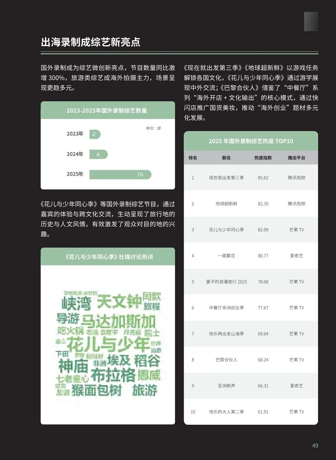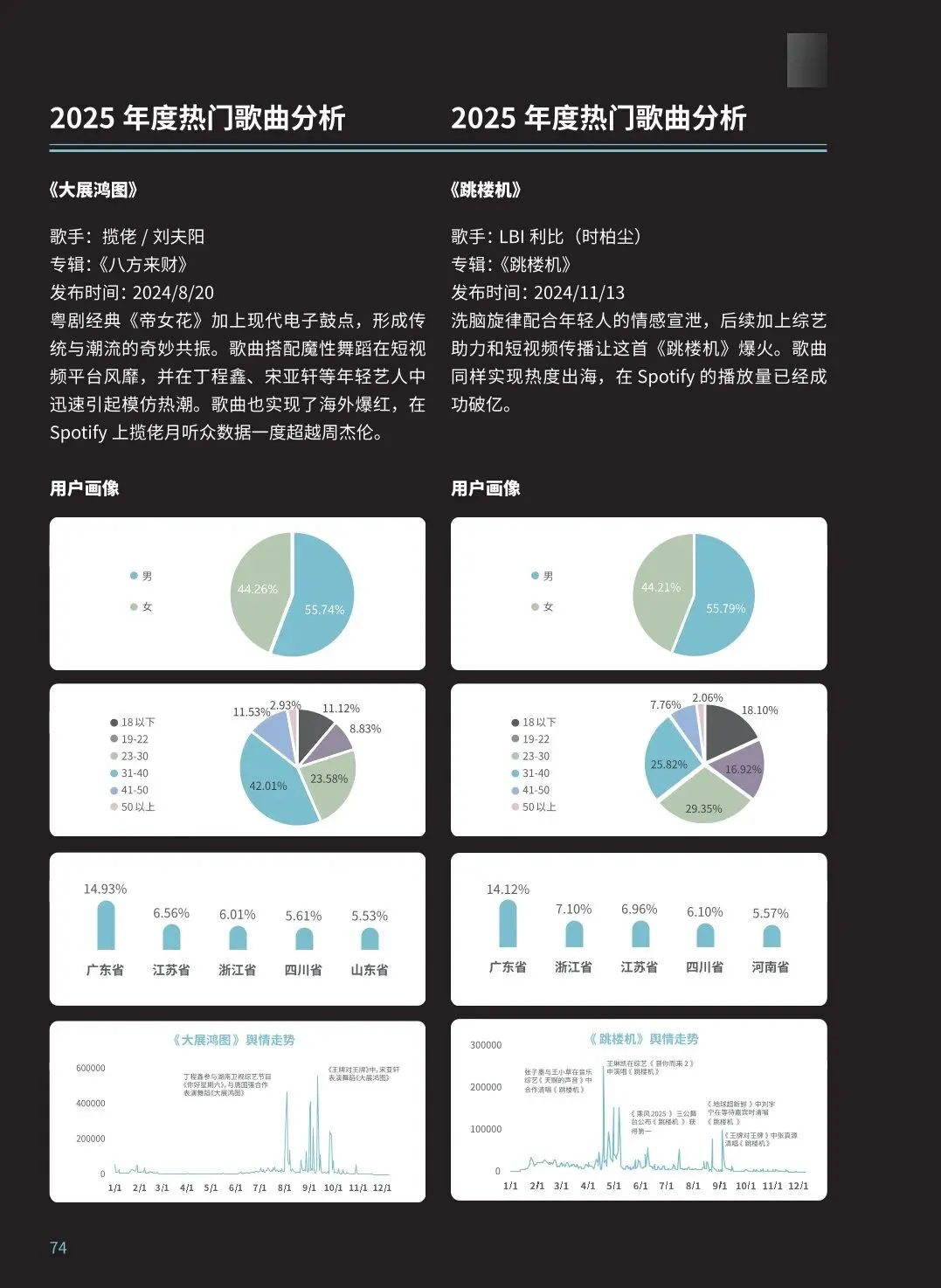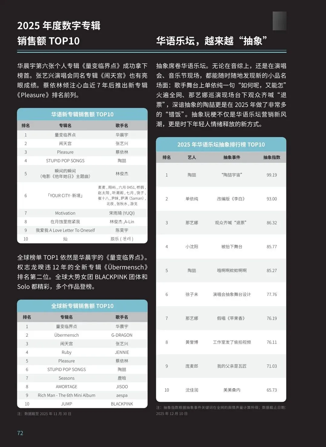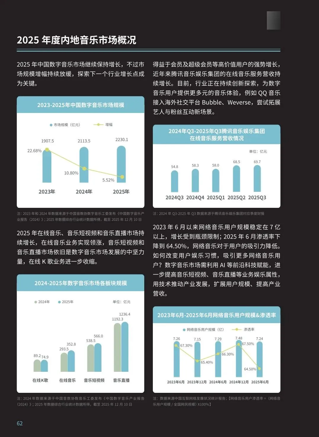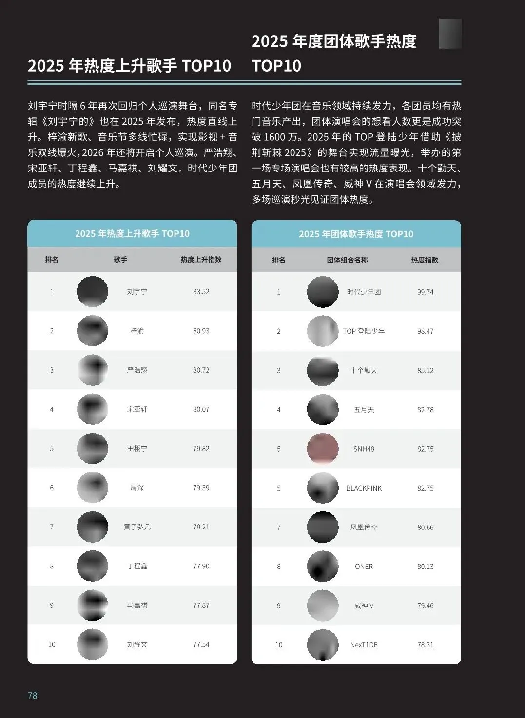 线下演出市场持续火热,演唱会与音乐节场次、票房均创历史新高,时代少年团、华晨宇等头部艺人巡演场场秒光,周杰伦、张杰等歌手的票务 “想看人数” 破千万,一线及新一线城市成为核心举办地。音乐领域数字音乐市场规模稳步增长,但现象级爆款缺席,音综播出数量下滑,部分经典 IP 停播,“抽象玩梗” 成为营销新风潮。同时,艺人跨界演出趋势明显,大量演员、网红涌入音乐节,带动粉丝消费与地方经济,政府部门也积极参与,民政部门甚至在音乐节现场提供结婚登记服务。