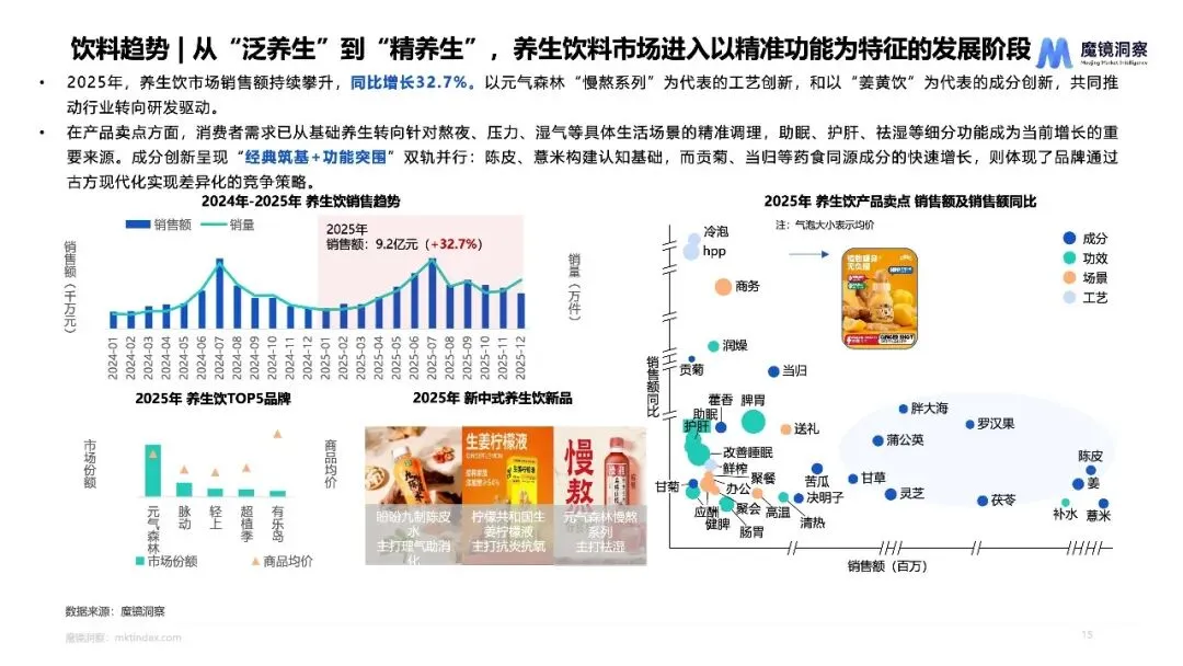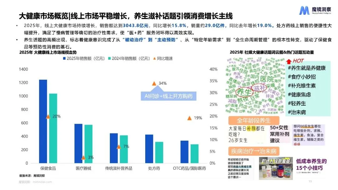 “大健康”正从养生概念蜕变为全龄刚需,精准营养与情绪价值驱动市场从“粗放滋补”迈向“科学靶向”时代。报告显示,2025年中国大健康市场规模突破3043.8亿元,同比增长15.8%,其中改善贫血、脑营养等细分赛道爆发式增长,保健食品销售额达1244.8亿,同比增长19.9%。数据揭示,消费者已不满足于传统“泛养生”,需求正快速裂变为针对熬夜、备考、产后等具体场景的精准调理,产品形态也从药片向软糖、咀嚼片等零食化剂型演进。