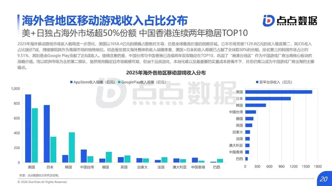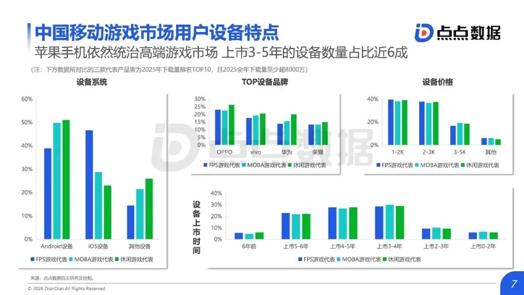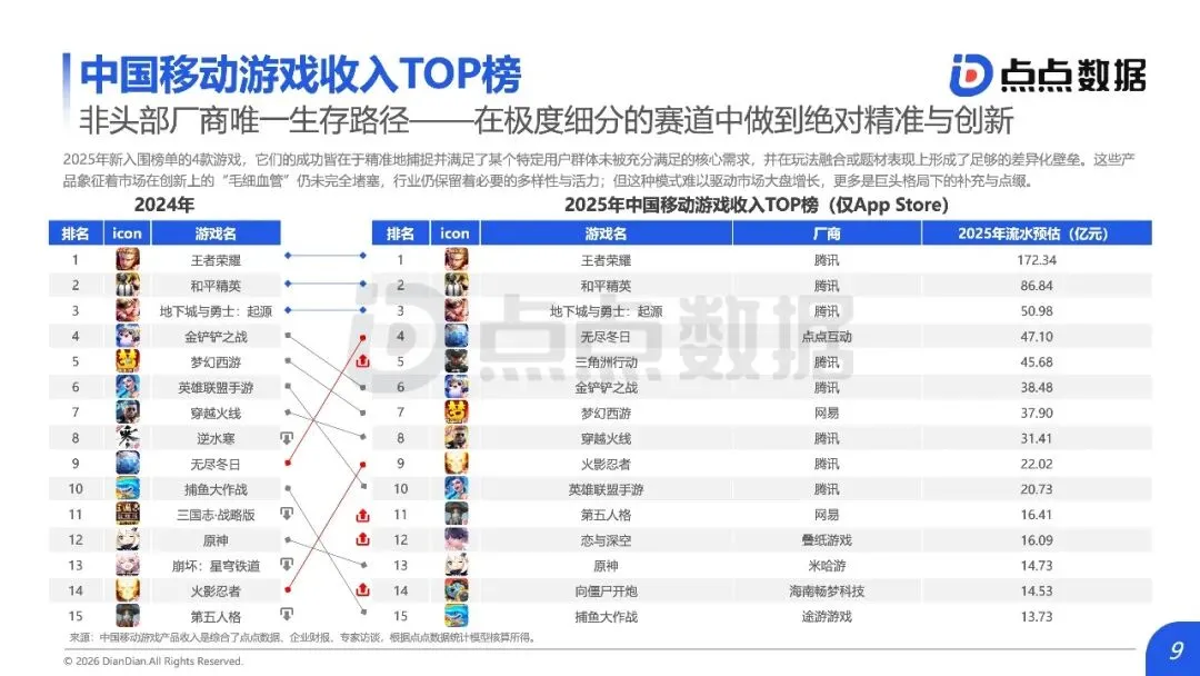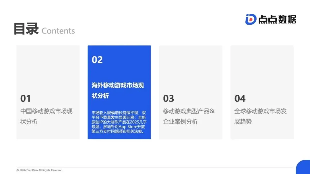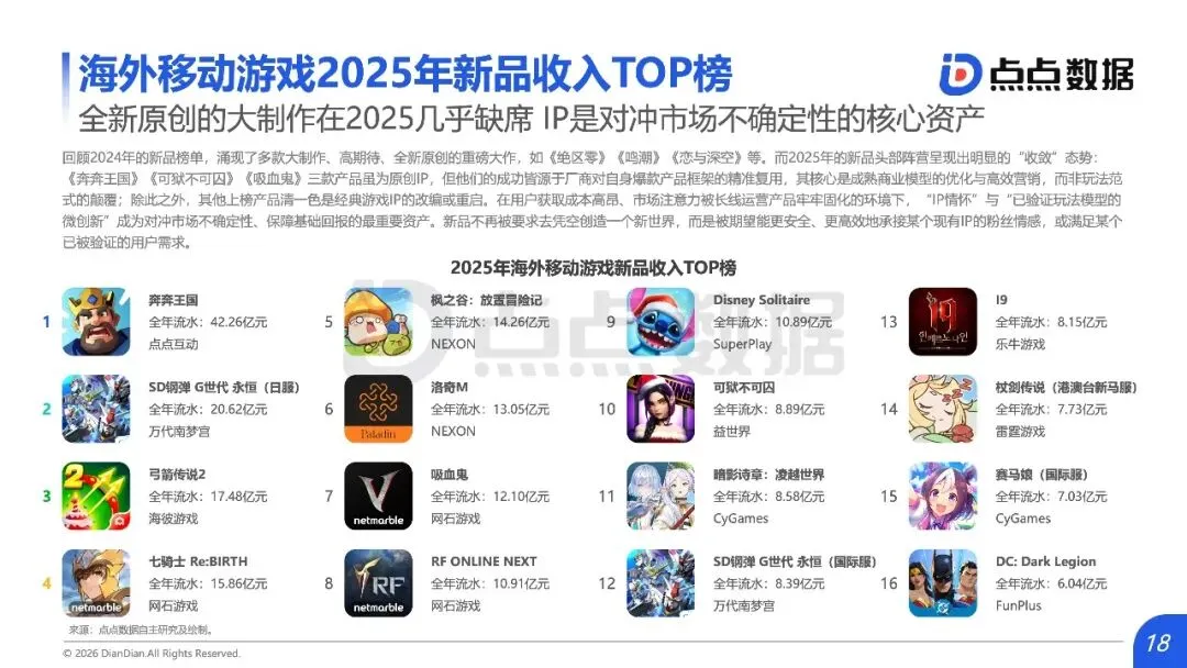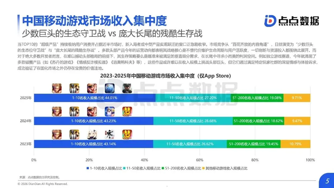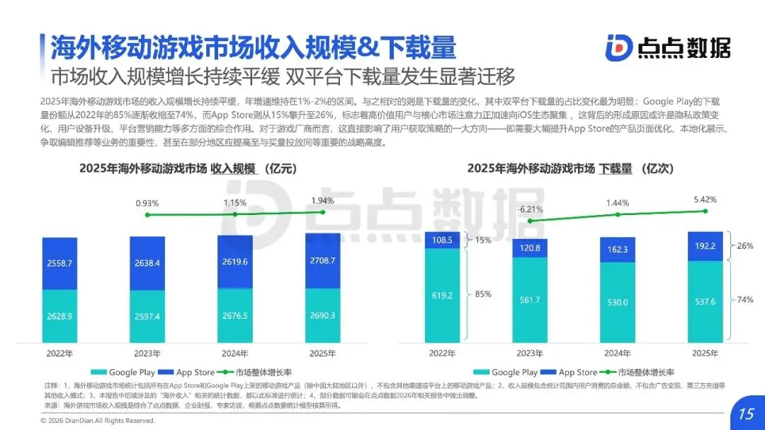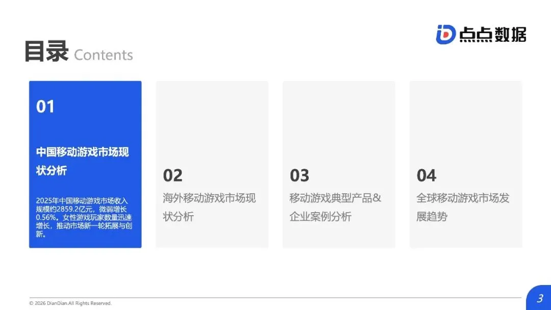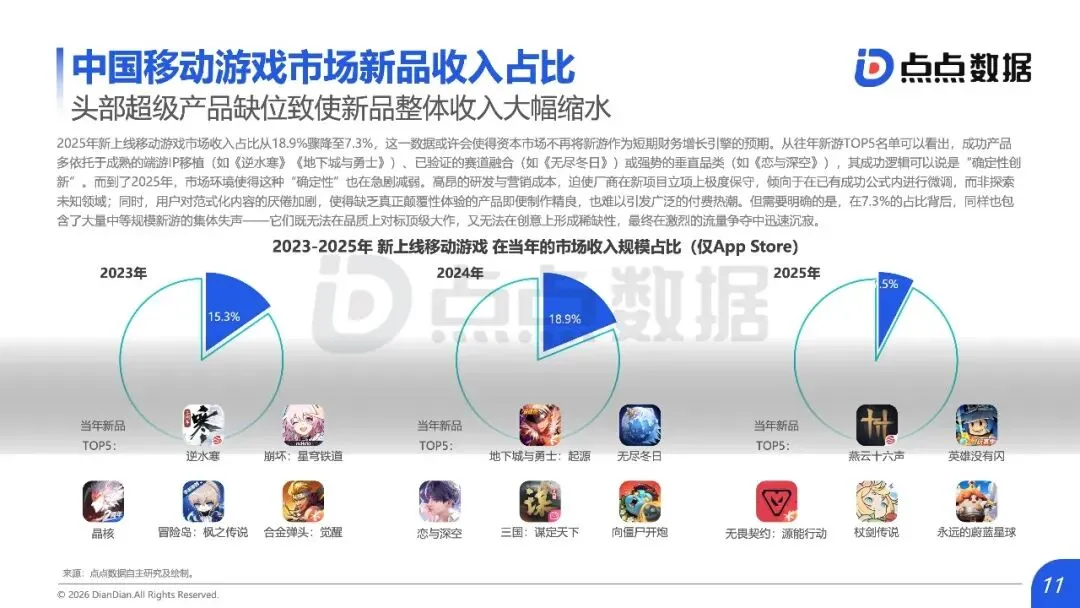 全球移动游戏市场正从“增量狂欢”滑入“存量绞杀”时代,内容范式红利耗尽与用户审美疲劳共同构筑了增长天花板,行业竞争焦点全面转向对确定性存量份额的精细化运营与对新兴赛道的精准卡位。报告揭示,2025年中国手游市场收入仅微增0.56%至2859.2亿元,新品收入占比从18.9%骤降至7.3%;海外市场同样增长平缓,TOP10产品占据中国近半收入,市场高度固化。数据背后是结构性瓶颈:过去依赖的IP移植、二次元升级等范式红利已尽,用户对“高品质换皮”产生消费倦怠。