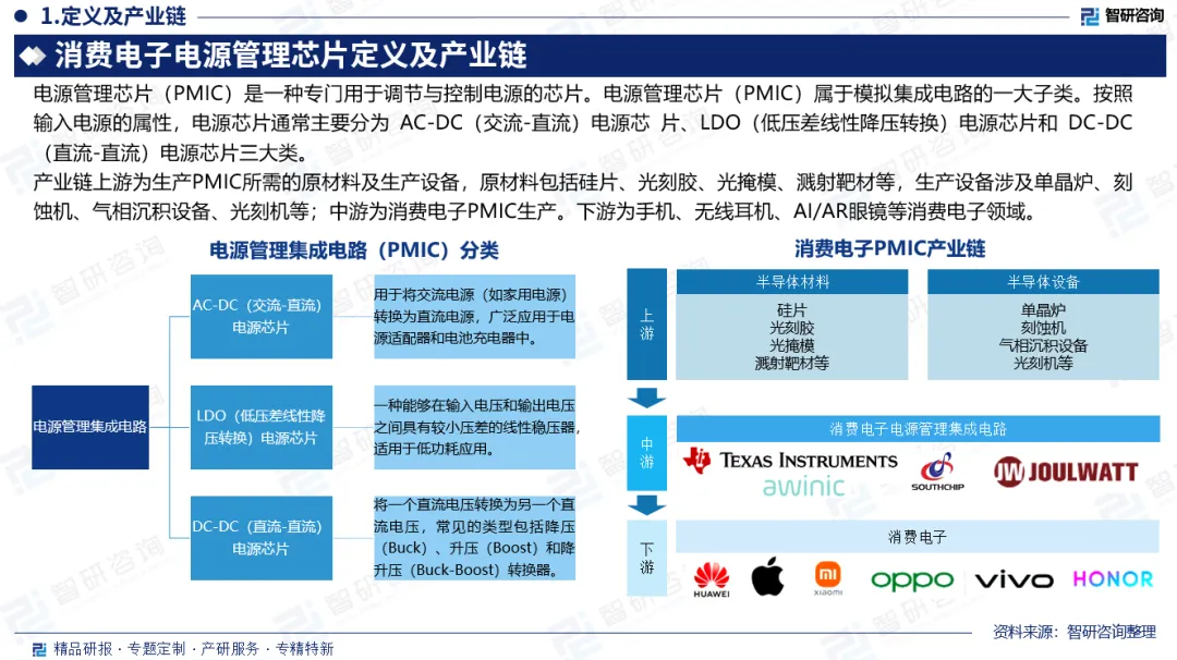 产业链:产业链上游为生产PMIC所需的原材料及生产设备,原材料包括硅片、光刻胶、光掩模、溅射靶材等,生产设备涉及单晶炉、刻蚀机、气相沉积设备、光刻机等;中游为消费电子PMIC生产。下游为手机、无线耳机、AI/AR眼镜等消费电子领域。