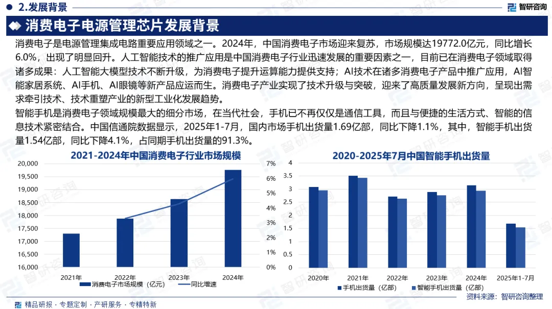 发展背景:消费电子是电源管理集成电路重要应用领域之一。2024年,中国消费电子市场迎来复苏,市场规模达19772.0亿元,同比增长6.0%,出现了明显回升。消费电子产业实现了技术升级与突破,迎来了高质量发展新方向,呈现出需求牵引技术、技术重塑产业的新型工业化发展趋势。