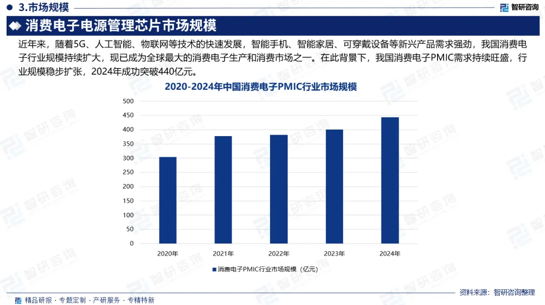 中国市场规模:近年来,随着5G、人工智能、物联网等技术的快速发展,智能手机、智能家居、可穿戴设备等新兴产品需求强劲,我国消费电子行业规模持续扩大,现已成为全球最大的消费电子生产和消费市场之一。在此背景下,我国消费电子PMIC需求持续旺盛,行业规模稳步扩张,2024年成功突破440亿元。
