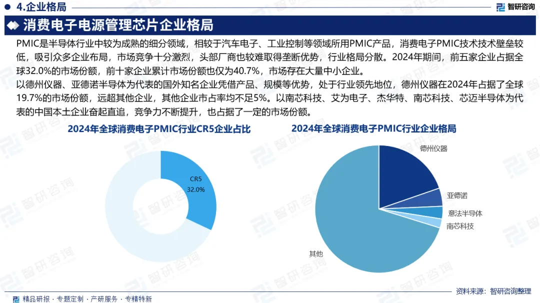 电源管理芯片(PMIC)是一种专门用于调节与控制电源的芯片。其主要作用是为电子设备提供稳定、高效的电源管理功能。2023-2024年,全球消费电子PMIC市场受到供应过剩及终端市场需求疲软的影响,促使制造商降价加速去库存,导致连续两年出现萎缩,2024年全球消费电子PMIC行业市场规模为860亿元,同比下滑3.7%;2025年随着消费电子逐渐回暖,消费电子PMIC也将呈现小幅增长态势。在智能手机市场,5G手机渗透率提升,包括射频芯片新增5G频段、手机摄像头从三摄升级为四摄、各种功能模块IC增加等,都需要更多PMIC做电源供应。包括LDO、DC/DC等降压转换的PMIC增加,PMIC在智能手机的单机价值量约提升30%至50%,带动全球智能手机PMIC行业市场规模由2022年的196亿元增长至2024年的215亿元,2025年进一步增长至219亿元。中国市场,近年来,随着5G、人工智能、物联网等技术的快速发展,智能手机、智能家居、可穿戴设备等新兴产品需求强劲,我国消费电子行业规模持续扩大,现已成为全球最大的消费电子生产和消费市场之一。在此背景下,我国消费电子PMIC需求持续旺盛,行业规模稳步扩张,2024年成功突破440亿元。PMIC是半导体行业中较为成熟的细分领域,相较于汽车电子、工业控制等领域所用PMIC产品,消费电子PMIC技术技术壁垒较低,吸引众多企业布局,市场竞争十分激烈,头部厂商也较难取得垄断优势,行业格局分散。2024年期间,前五家企业占据全球32.0%的市场份额,前十家企业累计市场份额也仅为40.7%,市场存在大量中小企业。以德州仪器、亚德诺半导体为代表的国外知名企业凭借产品、规模等优势,处于行业领先地位,德州仪器在2024年占据了全球19.7%的市场份额,远超其他企业,其他企业市占率均不足5%。以南芯科技、艾为电子、杰华特、南芯科技、芯迈半导体为代表的中国本土企业奋起直追,竞争力不断提升,也占据了一定的市场份额。