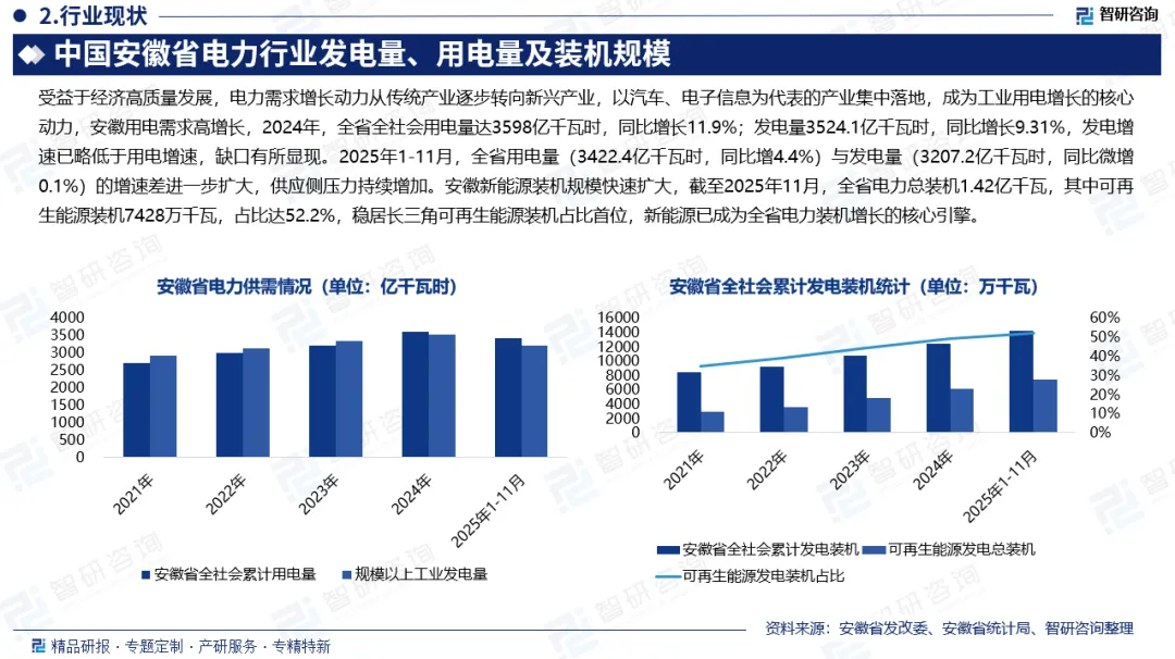 安徽省电力是支撑全省及长三角能源安全的核心产业,兼具基础性、公用性与能源转型引领性。近年来,安徽通过出台一系列政策,完善市场交易体系与价格机制,激发市场活力,保障电力供需平衡。安徽作为电力外送基地,电源结构多元,但受需求攀升影响,2022至2024年连续三年被定为电力供需红色预警区域,尖峰负荷特征突出,保供压力持续凸显。受益于经济高质量发展,安徽用电需求高增长,2024年用电量增速超发电量,缺口显现。安徽新能源装机规模快速扩大,截至2025年11月,可再生能源装机占比达52.2%,成为增长核心引擎。安徽还是国内电力现货市场试点省份,市场化改革成效显著,2024年绿电交易规模居全国第五。未来,安徽电力将深化能源结构升级,推进市场化改革,加速技术创新与业态融合,构建新型电力系统,实现能源转型与电力保供统筹兼顾。