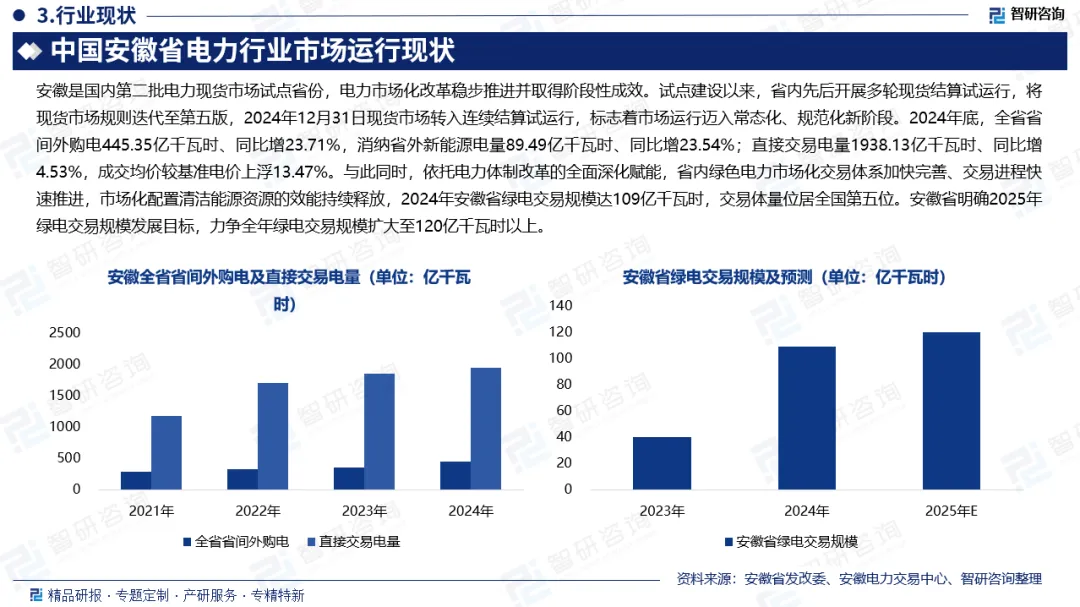安徽省绿电交易规模:近年来,安徽省深入推进可再生能源替代工程落地实施,持续加快提升终端用能绿色低碳发展水平,全省绿电生产与消费规模实现逐年稳步增长。与此同时,依托电力体制改革的全面深化赋能,省内绿色电力市场化交易体系加快完善、交易进程快速推进,市场化配置清洁能源资源的效能持续释放,2024年安徽省绿电交易规模达109亿千瓦时,交易体量位居全国第五位。安徽省明确2025年绿电交易规模发展目标,力争全年绿电交易规模扩大至120亿千瓦时以上。
