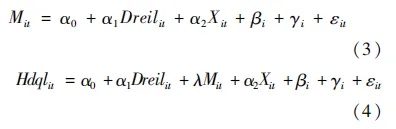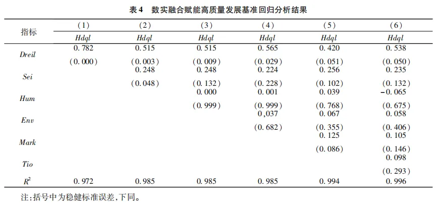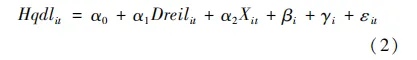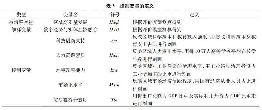 式中,Hqdlit表示区域高质量发展水平,Dreilit表示区域数字经济与实体经济融合水平,Xit表示控制变量,βi、γi、εit分别表示时间固定效应、个体固定效应、随机误差项,i与t分别表示区域和时间。区域高质量发展,应该是绿色、低碳、高效的发展,发展动力是科技创新,发展道路是开放发展。为了更好地反映数实融合对区域高质量发展的影响,结合已有的研究成果,选择科技创新支持、人力资源素质、环境改善能力、市场化水平、贸易投资开放度等作为控制变量,具体见表3。