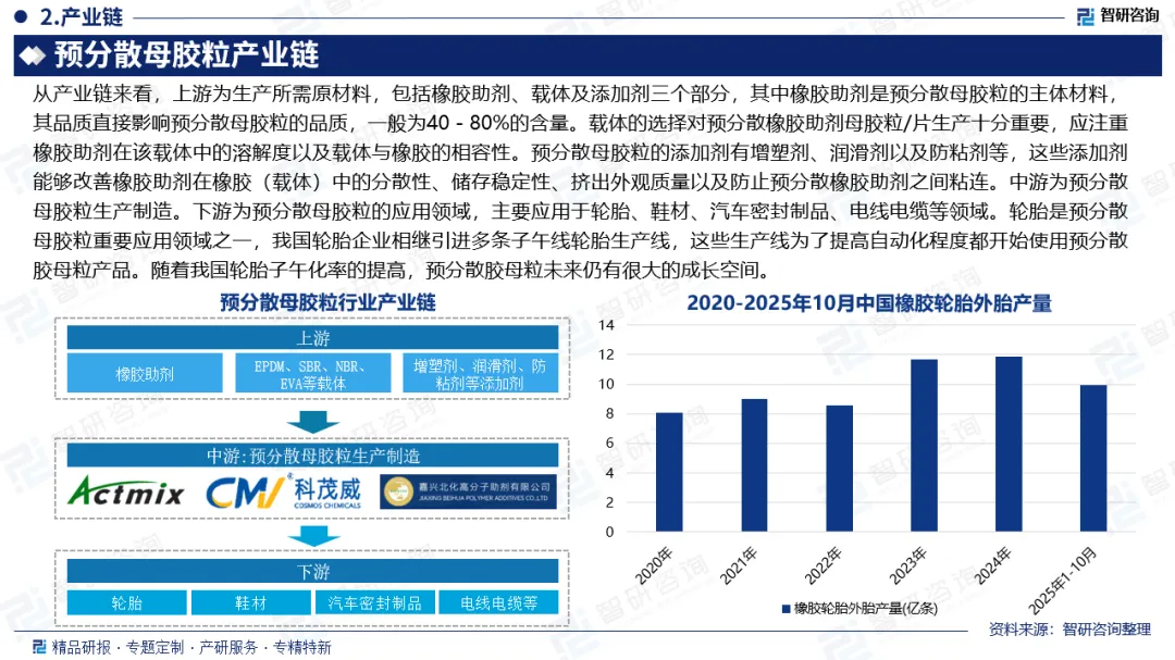 预分散母胶粒,也叫预分散橡胶助剂、橡胶助剂母胶粒、母胶粒。是以聚合物(一般是EPDM、SBR、NBR、EVA)为载体,加橡胶助剂和软化剂,通过特殊工艺将传统预分散橡胶助剂到聚合物中,得到一定浓度的均匀预分散体(挤出造粒)。预分散橡胶助剂是传统橡胶助剂的升级换代品,具有无粉尘、易分散、适合自动称量和自动连续低温混炼、提高混炼效率、储存稳定好等优点,日益受到业内重视,已在橡胶制品中大量应用。我国对橡胶助剂母粒的最早工业化应用是在20世纪90年代初,直到2017年11月,关于预分散橡胶助剂的标准才由中国橡胶工业协会发布团体标准《预分散橡胶助剂通用规范》(T/CRIA25001—2017),预分散橡胶助剂行业逐步规范。根据中橡协橡胶助剂专委会对协会下企业的统计,国内预分散母胶粒产量从2019年的6.2万吨增长至2024年的8.68万吨,年复合增长率达12.2%。2024年,受汽车、橡胶、轮胎等工业的快速发展影响,预分散母胶粒产量增速达14.7%。受到主要原材料价格下降影响,2022-2024年,中国预分散母胶粒售价呈下滑态势,以艾克姆为例,2024年期预分散母胶粒产品售价为2.53万元/吨,同比下滑4.7%。目前,国内预分散橡胶助剂生产企业数量众多,市场竞争激烈,且大多数企业的生产规模在千吨以下。工厂主要集中在广东、浙江、山东、福建、江西等地,为轮胎、制鞋、橡胶密封条、密封圈等配套。规模较大的生产企业包括宁波艾克姆新材料股份有限公司、山东阳谷华泰化工股份有限公司、东莞市福斯特橡塑科技有限公司、广东涵信威新材料有限公司、科茂威新材料股份有限公司等。预分散橡胶助剂行业集中度显著提升,形成了以艾克姆、阳谷华泰、福斯特等企业为代表的头部阵营,前三名占比从“十三五”末的40%左右提升至“十四五”末的近60%,头部企业在产能扩张、技术研发和市场开拓上主导行业发展。