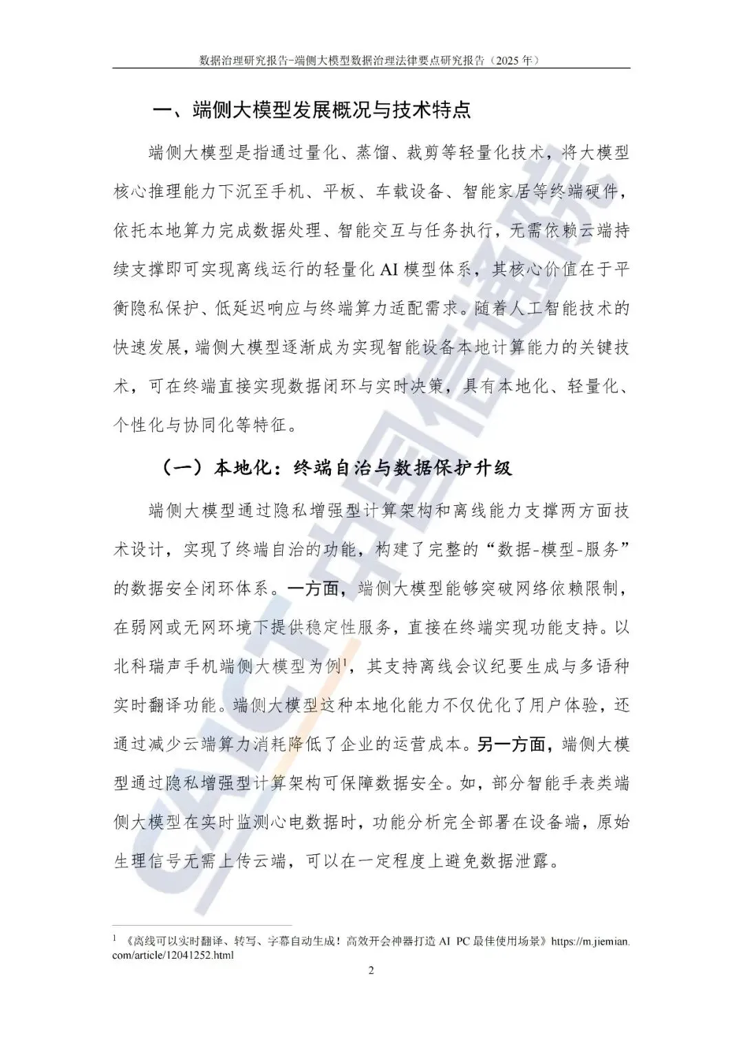 本报告由中国信息通信研究院于 2025 年 12 月发布,是信通院互联网法律研究中心推出的第六本数据治理专题报告,聚焦端侧大模型这一颠覆性智能技术的 Data Governance 法律核心问题。