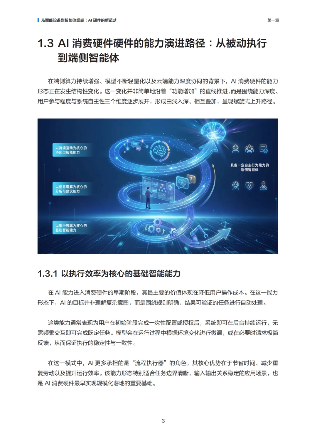 报告明确了 AI 消费硬件以 AI 为核心驱动、深度嵌入智能能力的定义与特征,指出嵌入式 AI 与端侧生成式 AI 是核心技术机遇,其能力将沿基础执行、信息分析、协同智能逐步升级并融合形成端侧智能体。从用户需求来看,用户对该产业认知趋于成熟,更看重个性化与自动化价值,付费意愿集中于健康管理等可感知价值的功能,10-30 元 / 月是主流接受价位,而体验不佳、价值不匹配是用户流失主因。