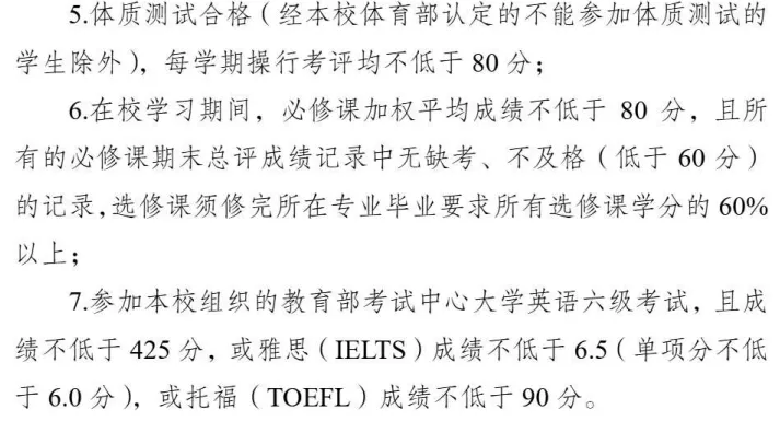在校学习期间,必修课加权平均成绩不低于80分,且所有的必修课期末总评成绩记录中无缺考、不及格(低于60分)的记录,选修课须修完所在专业毕业要求所有选修课学分的60%以上。