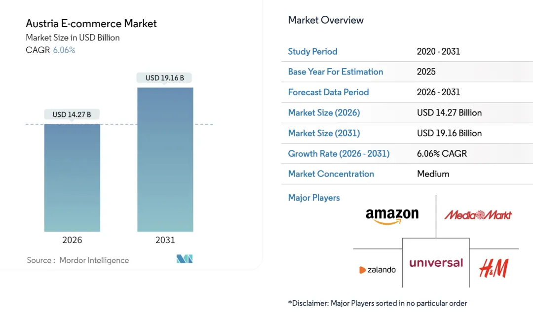 Mordor Intelligence的报告显示,2025年奥地利电商市场价值约为134.5亿美元,预计将从2026年的142.7亿美元增长至2031年的191.6亿美元,预测期内复合年增长率(CAGR)为6.06%。而根据另一篇统计口径略有不同的报告,奥地利电商市场在2020年至2024年间的实际复合增长率高达9.5%,2025-2029年的增速则预计放缓至5.7%。