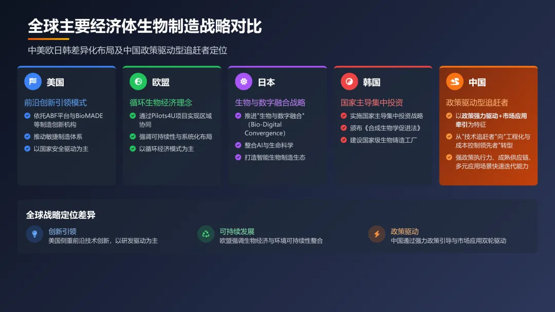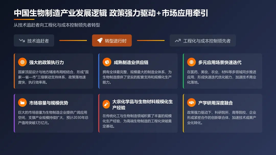 中国将在生物制造相关领域引领全球。美国代表前沿技术突破的创新,中国代表规模量产能力的跃升。也就是说,中国凭借集中力量突破、丰富的资源供给和产业化能力,将成为全球生物制造产业的主要引领者和核心驱动者,掌握产业供给能力和话语权。