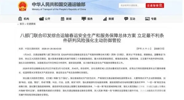 2026年1月下旬,交通运输部等八部门联合印发《2026年综合运输春运安全生产和服务保障总体方案》。2026年综合运输春运自2月2日开始至3月13日结束,共40天。《方案》明确强化新能源车充电服务保障,提前梳理形成充电特别繁忙服务区清单,“一区一策”制定充电保障方案;强化交通运输装备设施安全管理,深入实施“两客一危”车辆安全监管能力提升行动,充分应用信息化系统强化烟花爆竹等危险货物运输安全管控等。