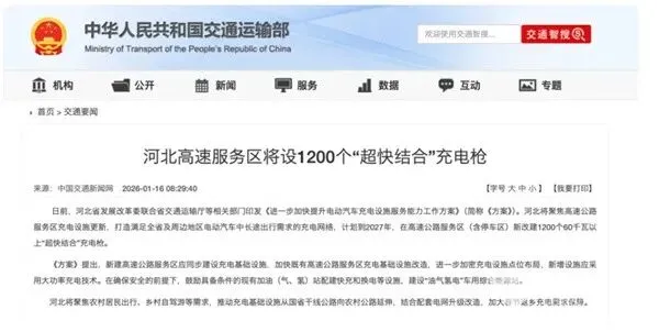 2026年1月中旬,河北省发展改革委、河北省交通运输厅等部门联合印发《进一步加快提升电动汽车充电设施服务能力工作方案》。河北将聚焦高速公路服务区充电设施更新,打造满足全省及周边地区电动汽车中长途出行需求的充电网络,计划到2027年,在高速公路服务区(含停车区)新改建1200个60千瓦以上“超快结合”充电枪;在确保安全的前提下,鼓励具备条件的现有加油(气、氢)站配建快充和换电等设施,建设“油气氢电”车用综合能源站。