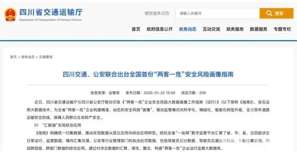2026年1月下旬,四川省交通运输厅与四川省公安厅联合印发《“两客一危”企业安全风险大数据画像工作指南(试行)》,通过对涉企数据的汇聚、清洗、整合,建立“两客一危”企业运行监管大数据库,为全省“两客一危”企业构建精准、动态的安全风险“画像”,推动监管模式向科学化、精细化、智能化转型升级。通过构建一套科学、统一的数据指标体系,四川将对企业的安全状况进行量化评估与动态评分,实现安全风险科学量化。
