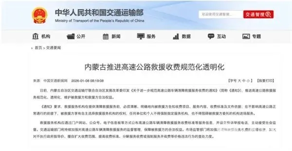 2026年1月上旬,内蒙古自治区交通运输厅联合自治区发展改革委印发《关于进一步规范高速公路车辆清障救援服务收费的通知》,推进高速公路救援服务规范化、透明化,维护被救援方和救援方合法权益。《通知》要求,救援服务机构在提供清障救援服务前,必须清晰、明确地向被救援方告知收费项目、服务内容、收费标准及文件依据;在不影响高速公路正常通行的前提下,被救援方享有自主选择救援服务机构的权利,任何单位和个人不得强制指定服务机构,也不得阻碍被救援方委托的机构进场服务。