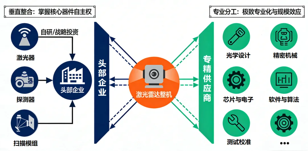 价格是规模化普及的关键。激光雷达能降低到如今的价格,背后是供应链持续的成本革命。为掌握核心器件自主权,头部企业纷纷向上游延伸,在激光器、探测器、扫描模组等领域展开自研或战略投资。与此同时,产业也催生了高度专业化的上游供应商,如专注于光学设计、模拟芯片、测试校准等环节高度专精的企业,它们靠极致的专业度和规模效应,把单个环节的成本和性能做到极致。这种“既整合又分工”的态势,形成了效率与韧性兼备的产业网络。