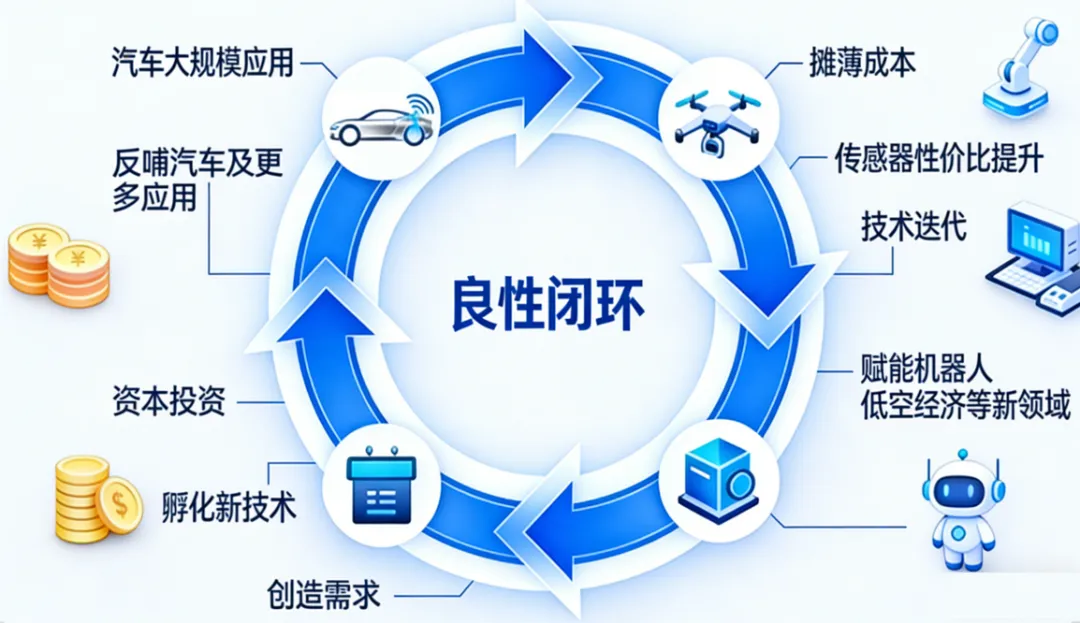 供应链不仅是创新的载体,其本身也已成为创新的策源地与加速器。最大的驱动力来自汽车产业的规模化效应。轩元资本创始人王荣进曾言:“如果不是汽车产业通过大规模应用推动成本下降,机器人根本用不起激光雷达”。汽车产业的海量需求,摊薄了前期研发与制造成本,使高性能传感器性价比更高,从而反向赋能了机器人、低空经济等新兴领域。此外,越来越多企业通过投资手段,布局上游技术或跨界应用,构建协同生态。这种基于供应链实力的生态孵化能力,正在为下一代技术创新注入资本与资源,形成 “现有规模养活技术创新,技术创新再去开拓新的市场”的良性闭环。