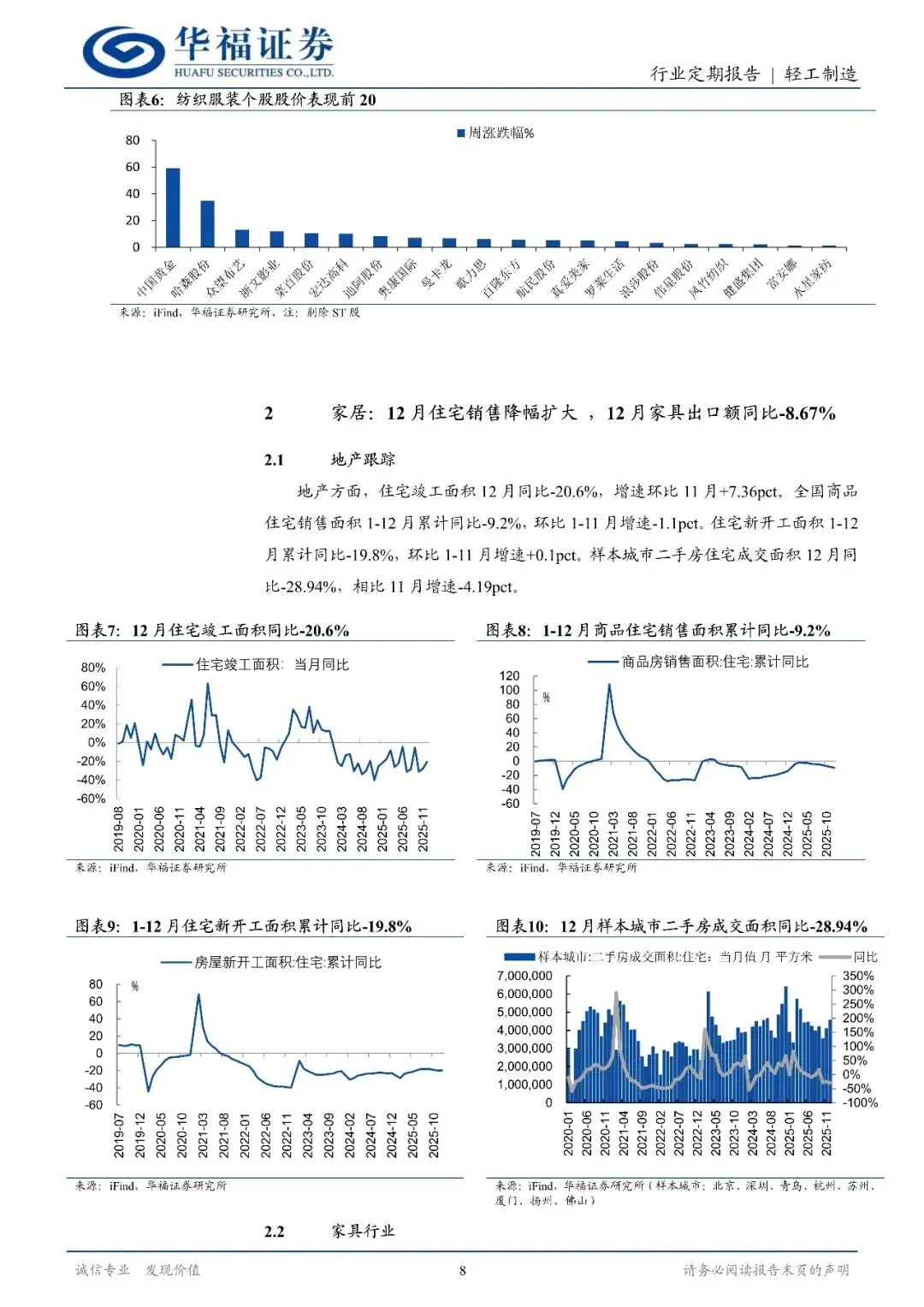 1)家居:1据财联社报道,多家房企已不被监管部门要求每月上报"三条红线"指标,在政策利好预期升温的背景下,近期家居板块他值有所修复.22025年上海二手房全年成交25.4万套,创近四年新高,2026年以来上海二手房成交回暖、挂牌量下降,供需关系边际改善地产销售回暖利好家居估值修复,建议关注春节后楼市小阳春的持续性。3目前家居景气虽持续磨底,但板块估值和机构持仓均处历史低位,维持原有观点:短期看好板块估值修复、Q2后随着国补基数降低基本面有望逐步迎环比改善,公司关注软体板块顾家家居、喜临门、慕思股份、敏华控股,定制板块欧派家居、索菲亚、志邦家居、金牌家居、我乐家居,智能家居好太太、好菜客、奥普科技、前牌家居苦,以及逆势高增的家居五金龙头悍高集团。
