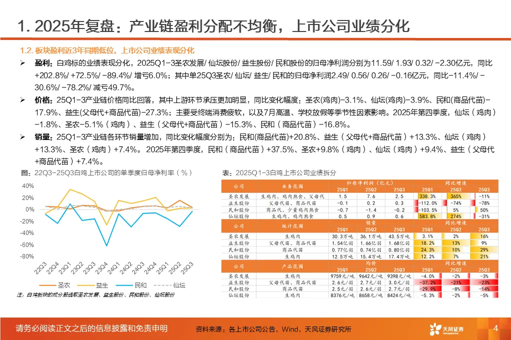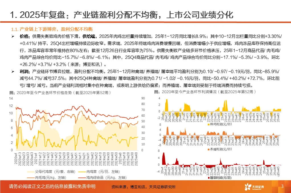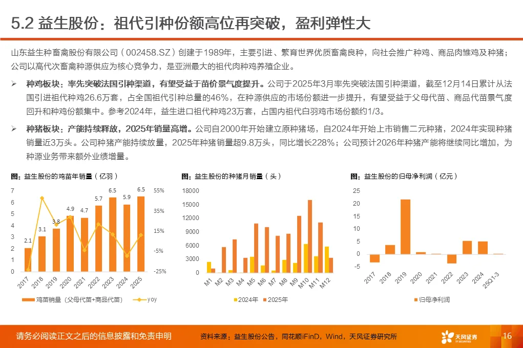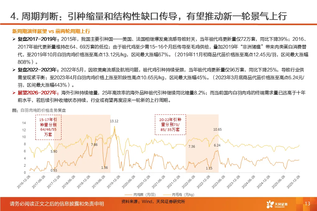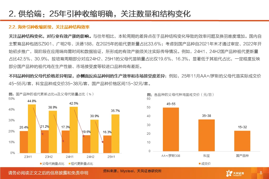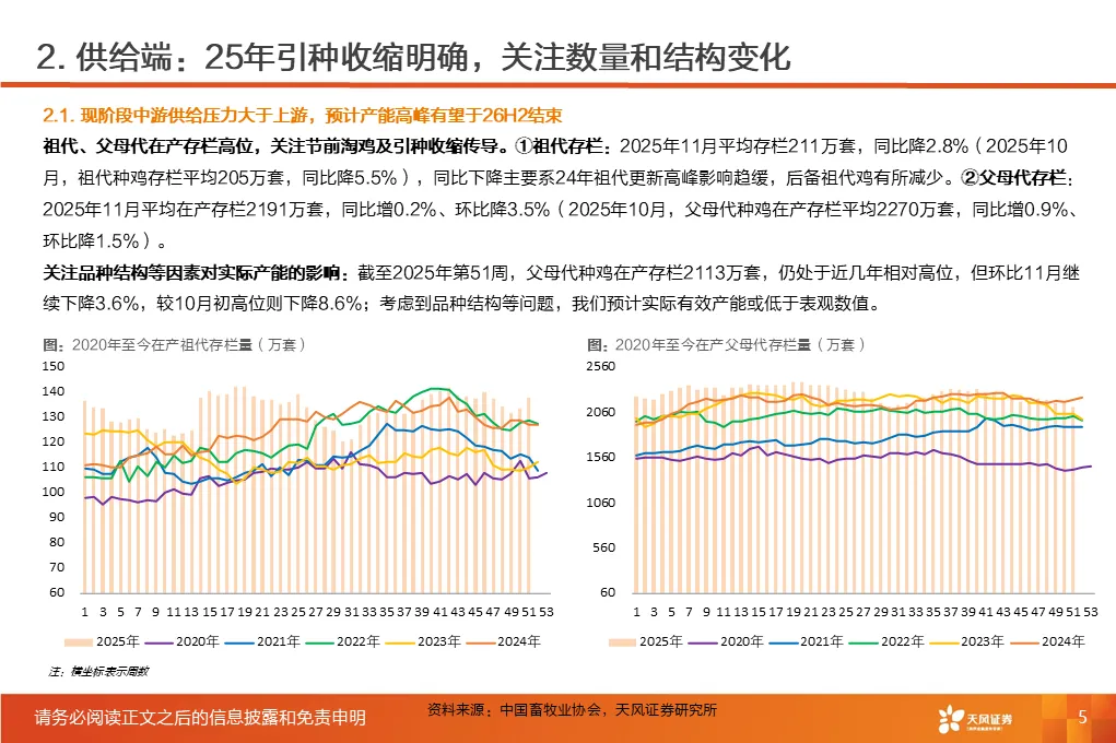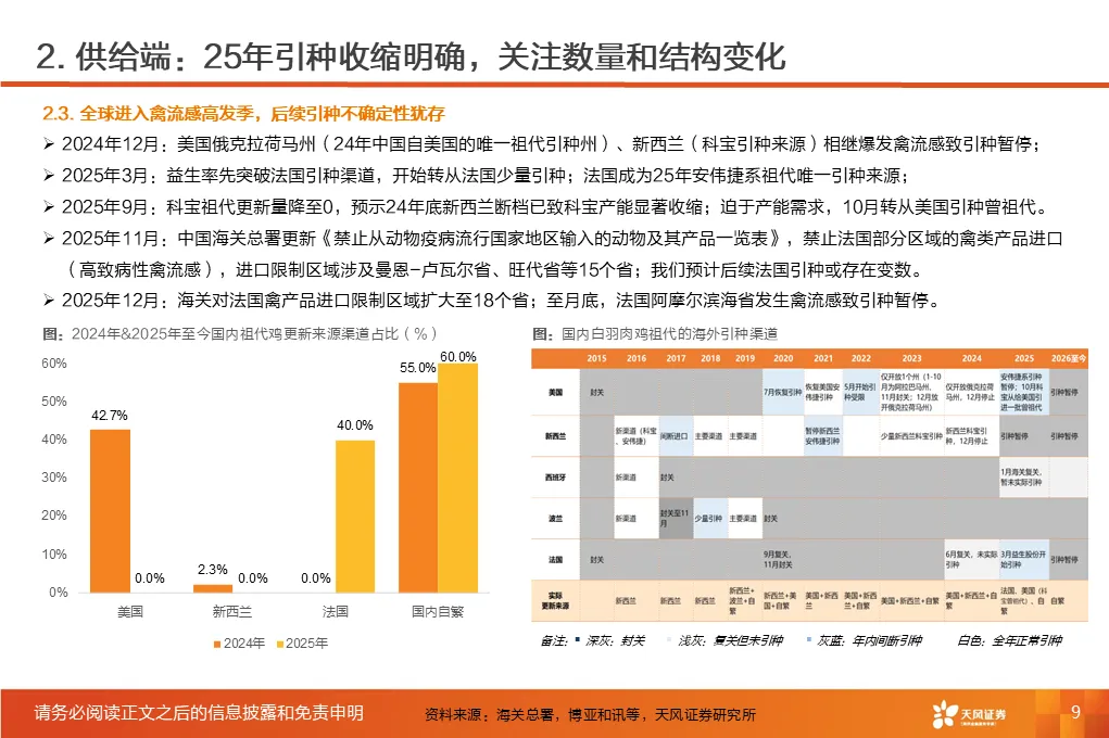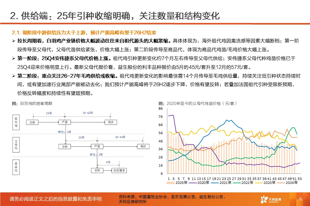 ①行业磨底已持续3年,产能收缩意愿强化,25Q1-3作为行业头部代表的上市板块盈利处于近3年同期低位。②受全球高致病性禽流感影响,上游祖代引种震荡,虽国产增量较明显,但仍存在品种结构变化带来的产能效率损失。2025年1-12月祖代更新量同比下降2%(其中,海外引种近62万套,同比下降8.2%,除10月科宝曾祖代外,AA+、罗斯308、利丰均来自法国,而2024年其主要来自美国和新西兰)。③25年11月底,中国海关总署公示禁止法国曼恩-卢瓦尔省等十余省份禽及相关产品进口;12月29日,法国阿摩尔滨海省发生H5N1高致病禽流感致引种再度暂停;预计安伟捷系引种量有可能进一步下降。我们预计,海外引种受限及品种结构变化将进一步放大上游供给缩量及效率问题;行业产能高峰或于26H2开始转向下行,有望推动价格景气反转。