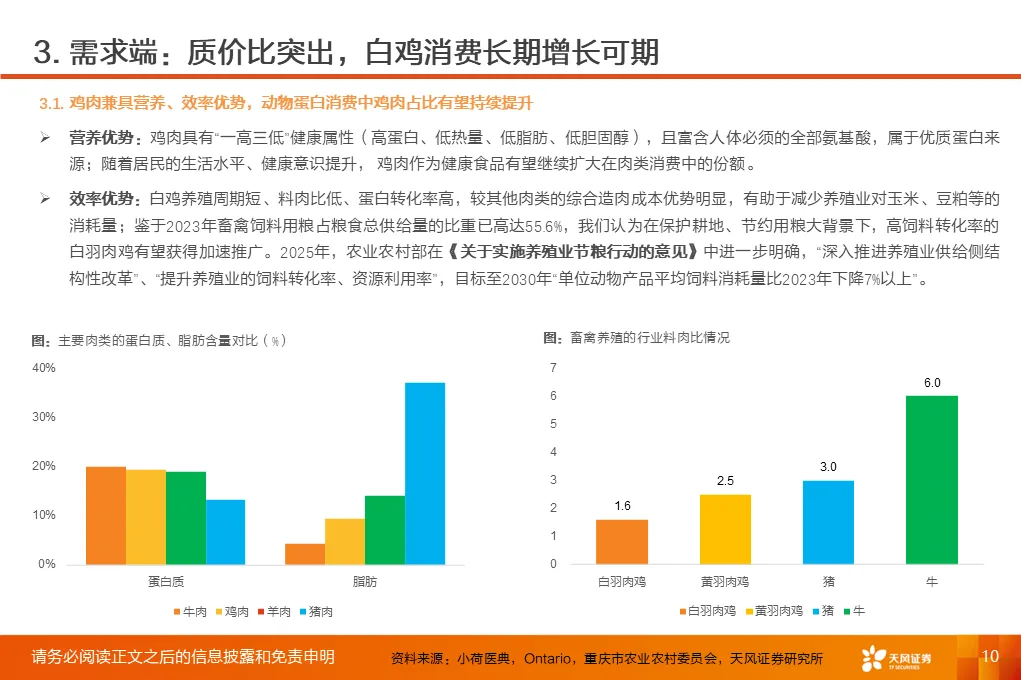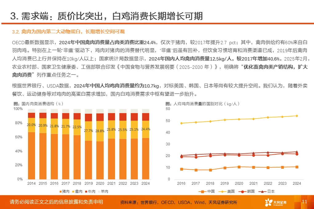 ①上一轮“非瘟”驱动下,白鸡对猪肉的消费替代明显,2019年后国内人均鸡肉消费抬升至10kg/人以上;对标美国、韩国、日本等仍有较大提升空间。②鸡肉作为优质蛋白来源,兼具健康、效率优势,近年在肉类消费中的份额稳步提升;2025年,农业农村部、卫健委、工信部联合印发《中国食物与营养发展纲要(2025-2030年)》,明确将“优化畜禽肉类产销结构,扩大禽肉消费”列作重点任务之一。③麦当劳、百胜中国等头部西餐品牌持续拓店并提出涨价计划,中餐品牌连锁化率提升,双轮驱动对鸡肉食材需求增加;同时,扩内需、促消费政策提振,利好白鸡库存消化和需求向上。