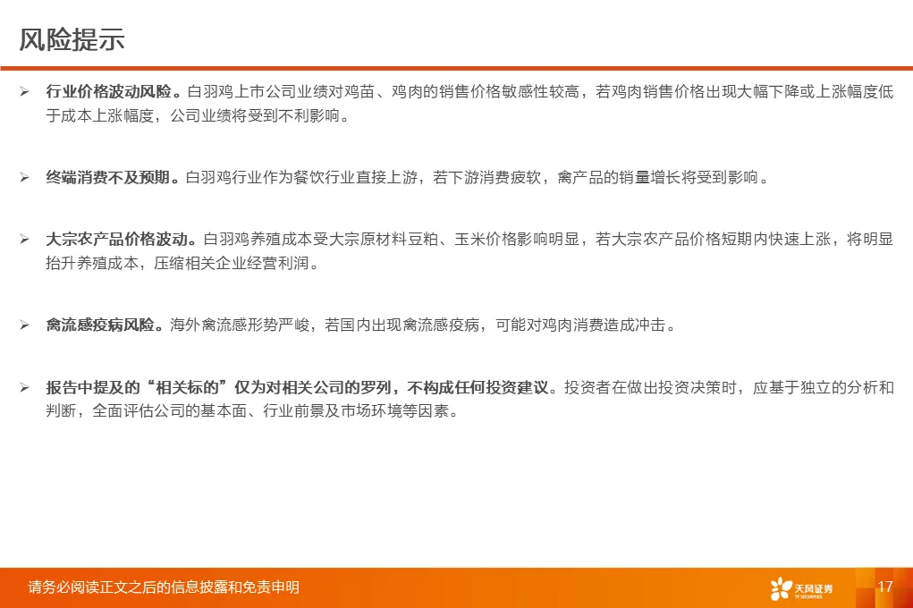 风险提示:行业价格波动风险,终端消费不及预期,大宗农产品价格波动,禽流感疫病风险;“相关标的”仅为对相关公司的罗列,不构成任何投资建议。