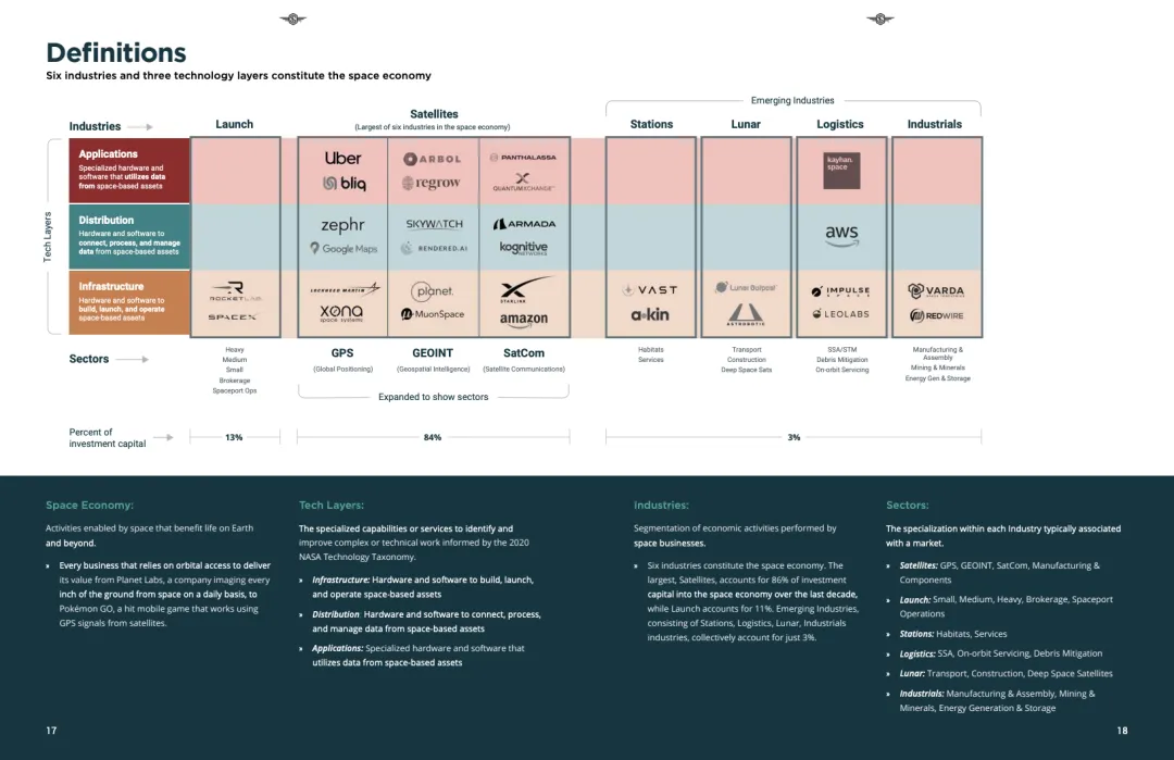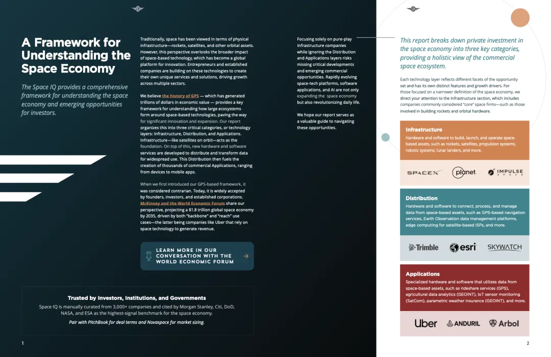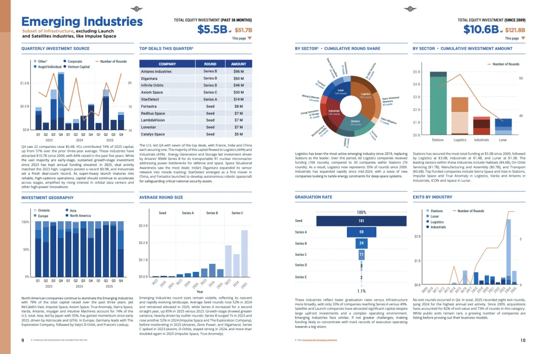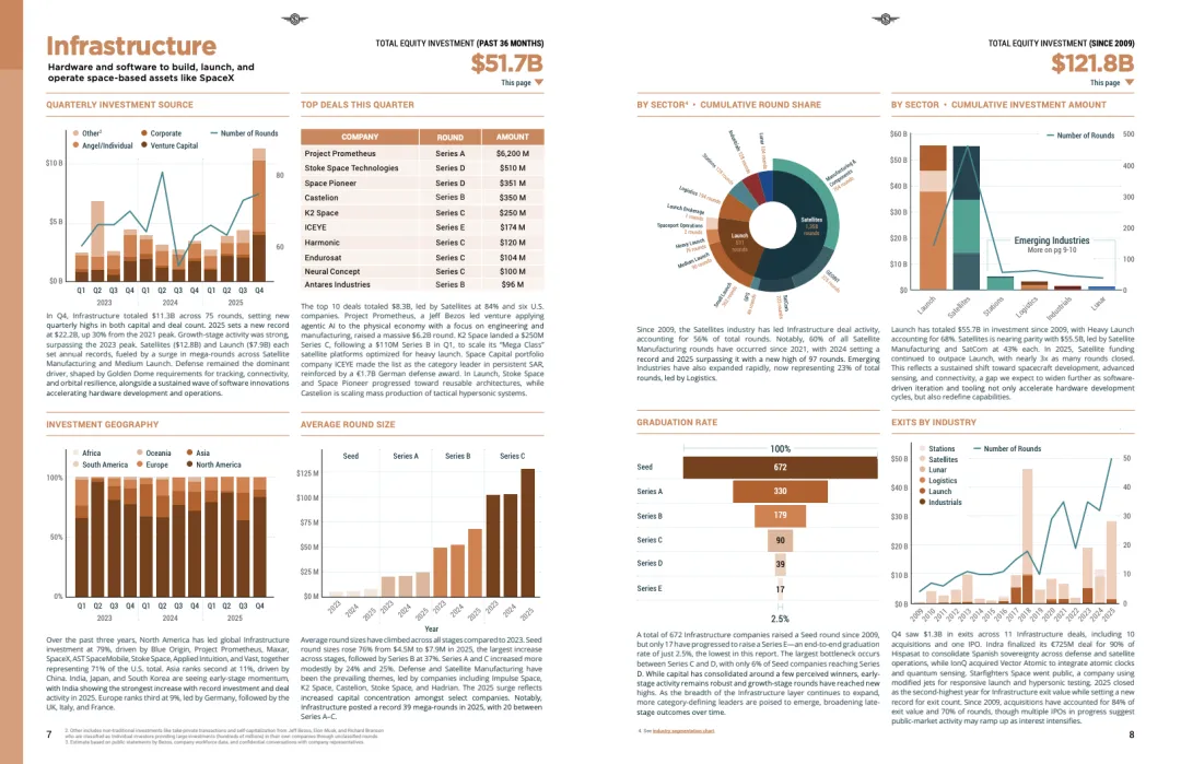 从结构看,基础设施层全年吸引222亿美元资金,同比增长约30%,其中卫星制造与发射分别达到128亿美元和79亿美元,均创年度新高。防务需求成为核心驱动因素,叠加软件定义硬件、可重复使用发射等技术成熟,推动大额融资高度集中,全年出现39笔超大轮融资。