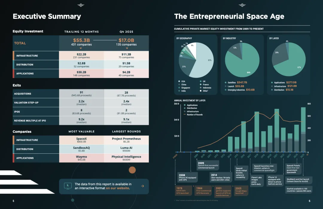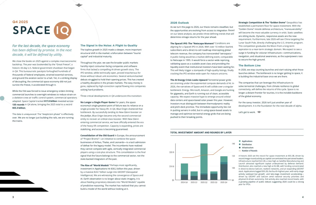 2025年第四季度,全球空间经济私募投资在复杂宏观环境下逆势走强。Q4单季完成135笔融资,投资额达170亿美元,推动全年总投资升至553亿美元,创历史新高。数据表明,商业航天已实现与传统宏观周期的阶段性脱钩,资本对空间产业的长期确定性形成共识。