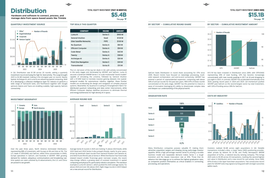 分布层在2025年表现尤为突出,全年投资28亿美元,刷新历史纪录。地理信息智能和卫星通信成为增长引擎,前者在2024至2025年连续加速,Q4推动其投资占比分别达到32%。平均融资规模显著抬升,反映空间计算与物理AI正从概念走向工程化落地。