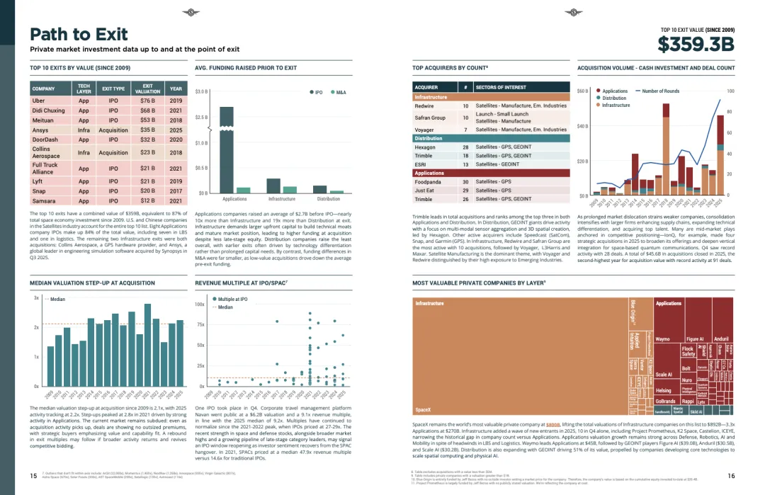 退出端同样回暖。2025年完成并购91起、IPO 8起,全年退出总额接近历史高位。估值中位数较上一轮提升约2.2倍,显示资本市场对空间资产的定价逻辑正在由“发射次数”转向“持续现金流与战略价值”。