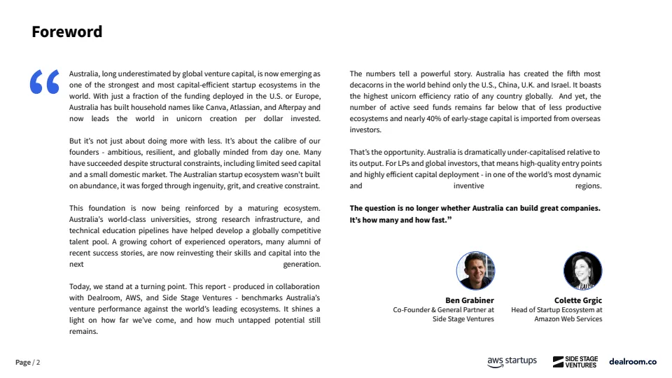 综合来看,澳大利亚创投生态已进入“高产出、低配置”的关键阶段。一方面,其在独角兽效率、十角兽密度和退出质量上已达到全球一线水准;另一方面,早期资本供给不足、本土资金占比偏低,使其长期存在系统性低估。未来三至五年,随着全球资本向高效率市场回流,以及AI、能源与深科技赛道持续放量,澳大利亚有望从“被低估的高效市场”,演变为亚太地区最具性价比的长期配置型创投目的地。