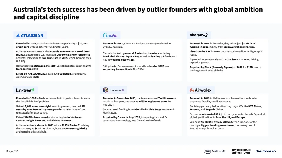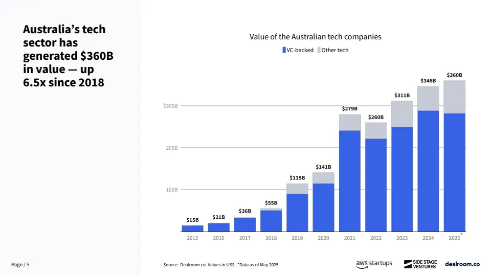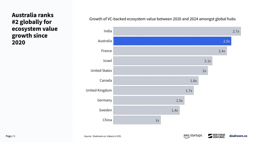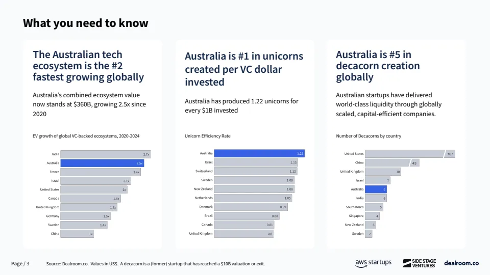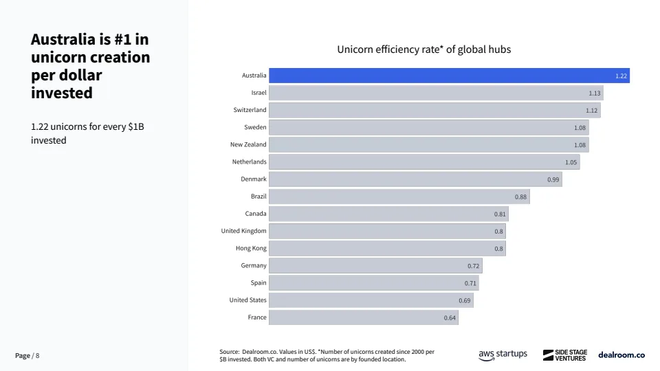 澳大利亚正在从长期被忽视的创投市场,转变为全球资本效率最高的创业生态之一。数据显示,截至2025年,其科技生态系统总价值已达3600亿美元,自2018年以来增长6.5倍,2020年至2024年期间生态价值增长2.5倍,增速位居全球第二。更具代表性的是,澳大利亚每投入10亿美元风险资本,平均可产生1.22家独角兽企业,全球排名第一,显著高于美国、欧洲等成熟市场。