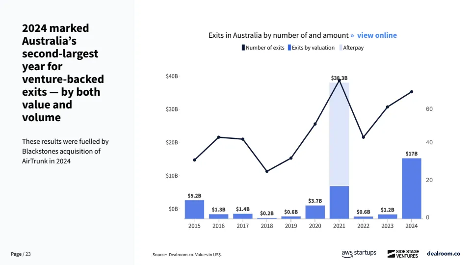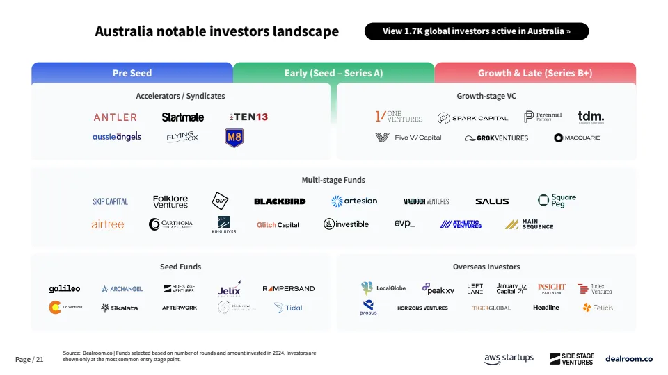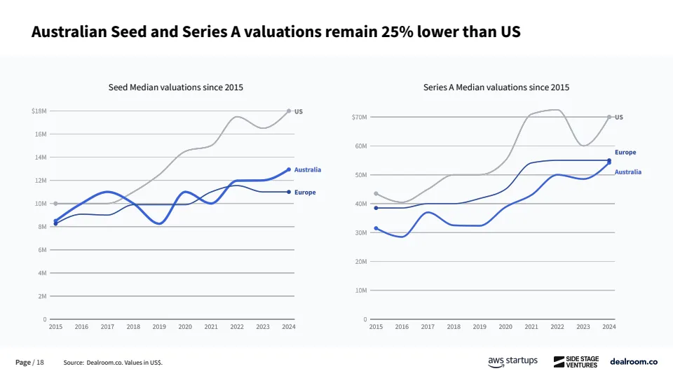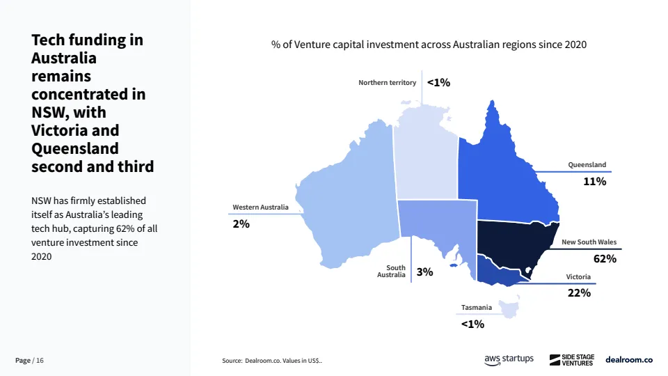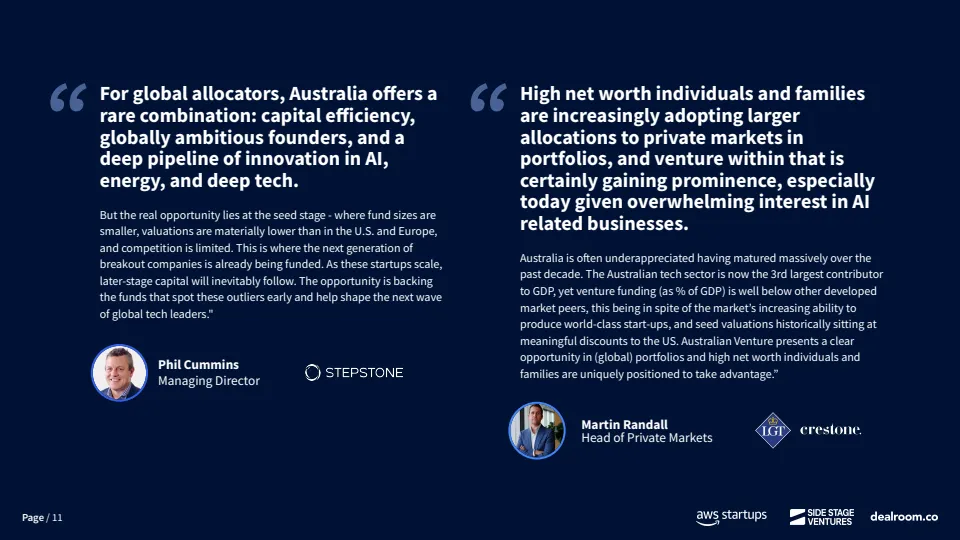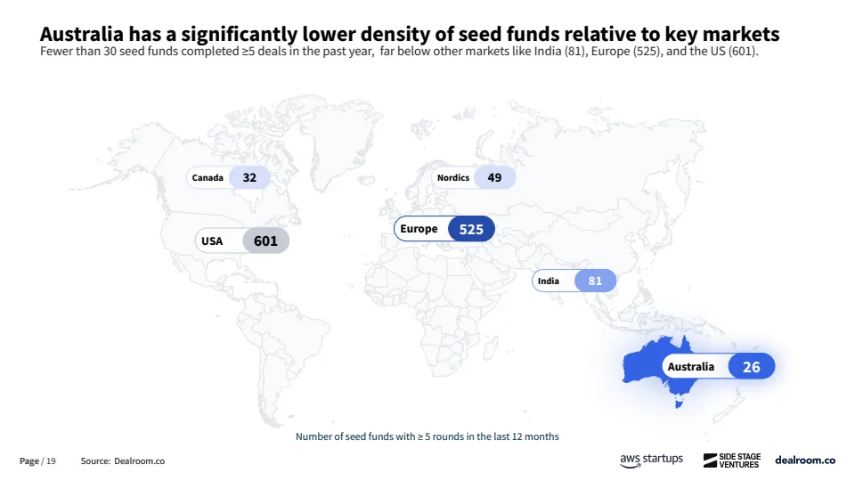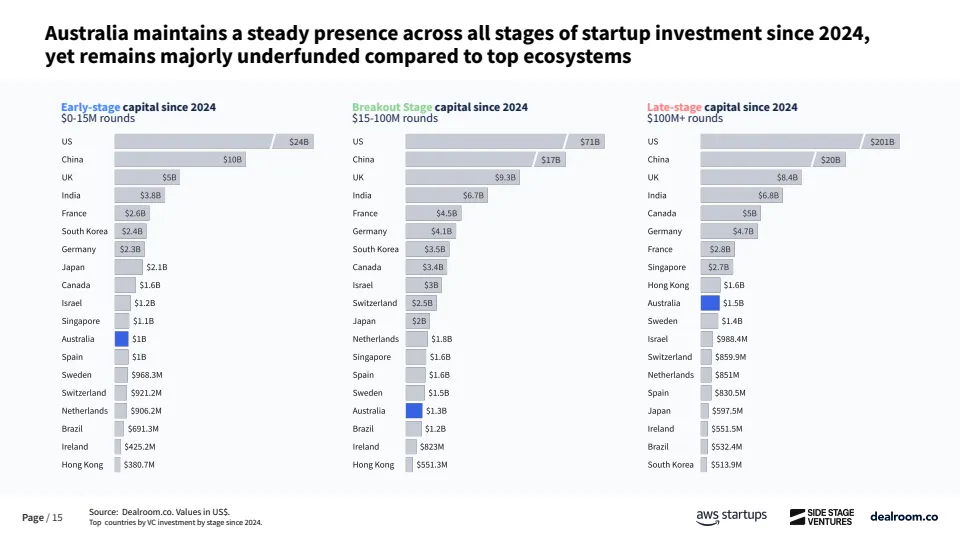 资金来源方面,澳大利亚对海外资本依赖度显著高于主要经济体。自2023年以来,早期阶段资金中仅61%来自本土投资者,约39%依赖海外资金,而欧洲和美国本土资金占比分别为73%和80%。这在一定程度上反映出本地早期资本供给不足,也为全球LP和跨境VC提供了估值更低、竞争更小的进入窗口。