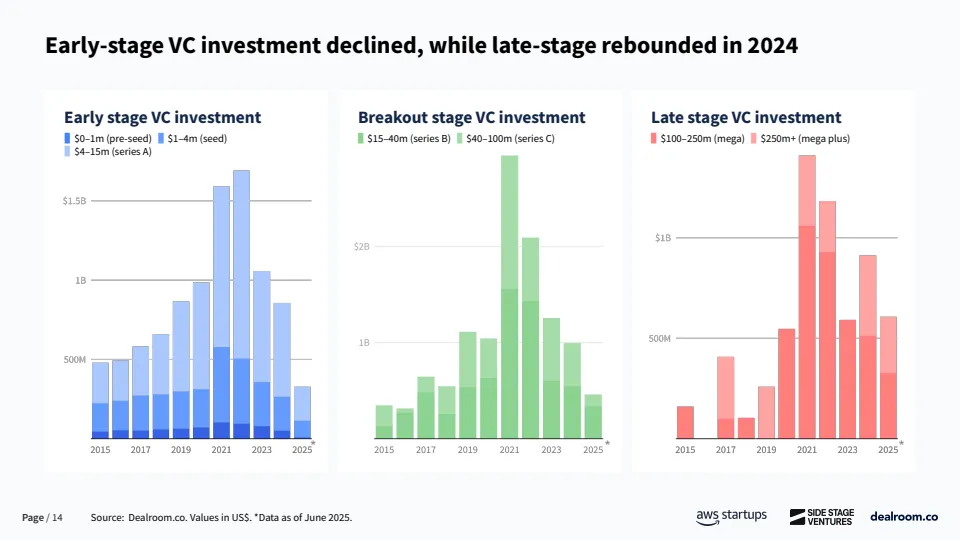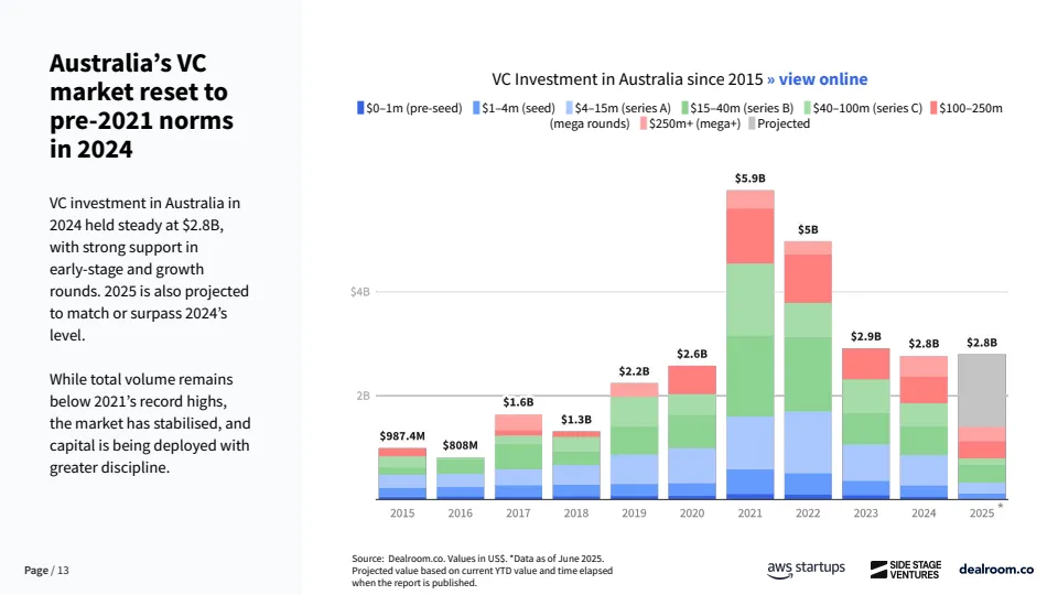 从资金结构看,澳大利亚创投市场仍处于明显的“资本不足”状态。2024年全年VC投资额约28亿美元,较2021年高点明显回落,但已恢复至理性区间。结构上,早期投资占比下降,后期与大额融资在2024年出现反弹。更值得关注的是,种子轮基金密度偏低,过去一年内完成5笔以上交易的种子基金不足30家,远低于美国的600余家和欧洲的500余家。